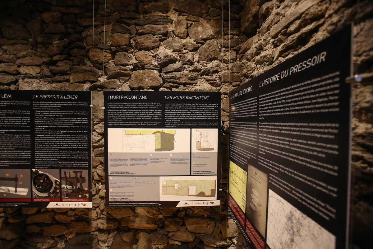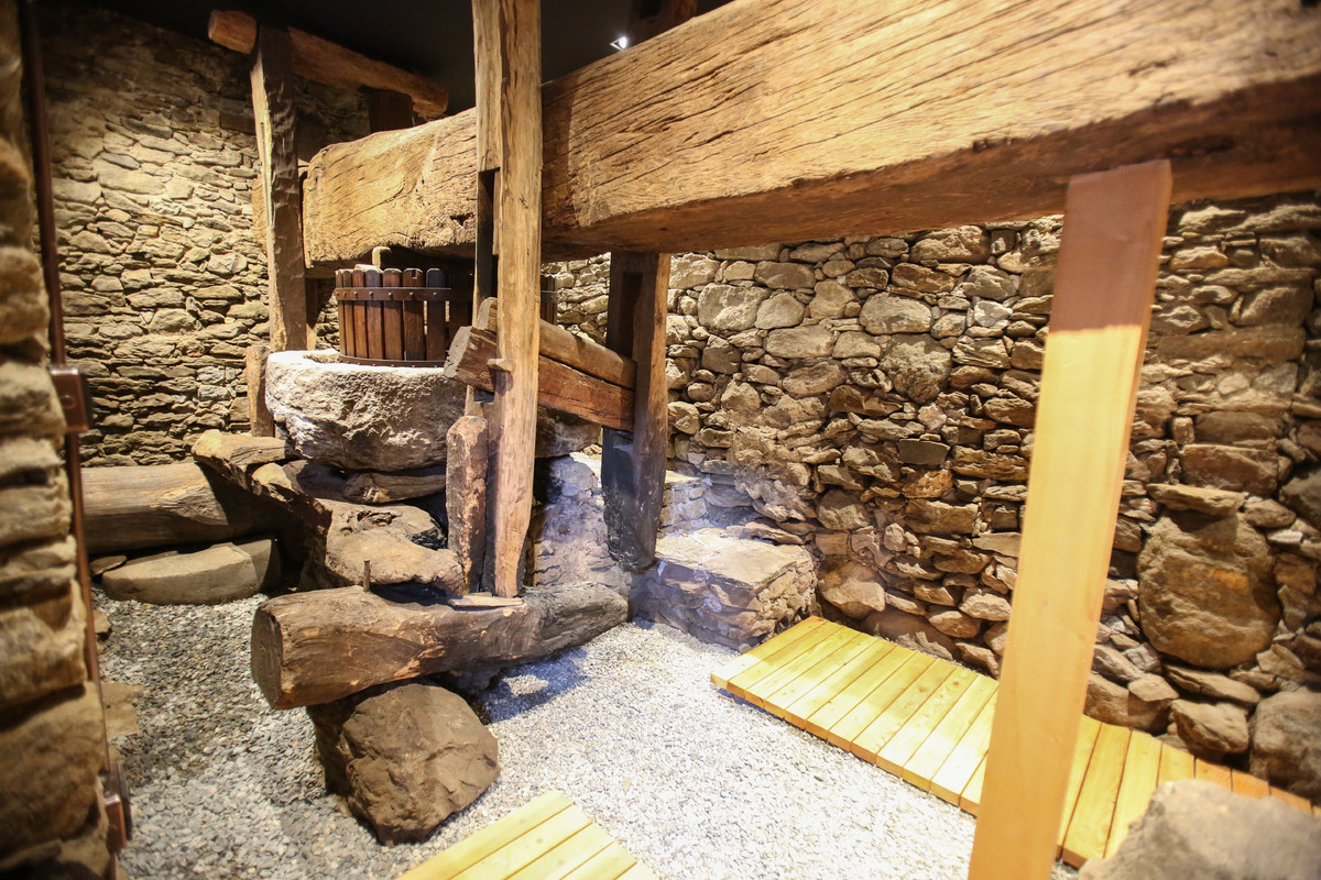 The ancient press, now restored, is located in a long and narrow room, with free access.