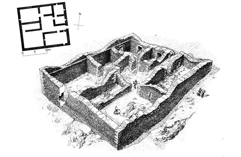 The ruins form a square structure with its front facing North and cover an area of 480 m2. Its walls are not dry-stone built, as those of the surrounding mountain pastures, but using stones thoroughly cemented with mortar and sand.