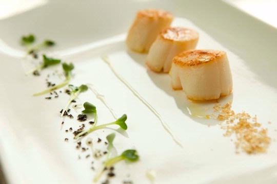 Kamut and saffron ravioli filled with prawns and ricotta with speck and orange sauce