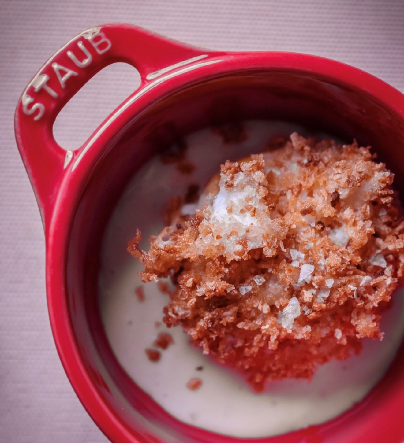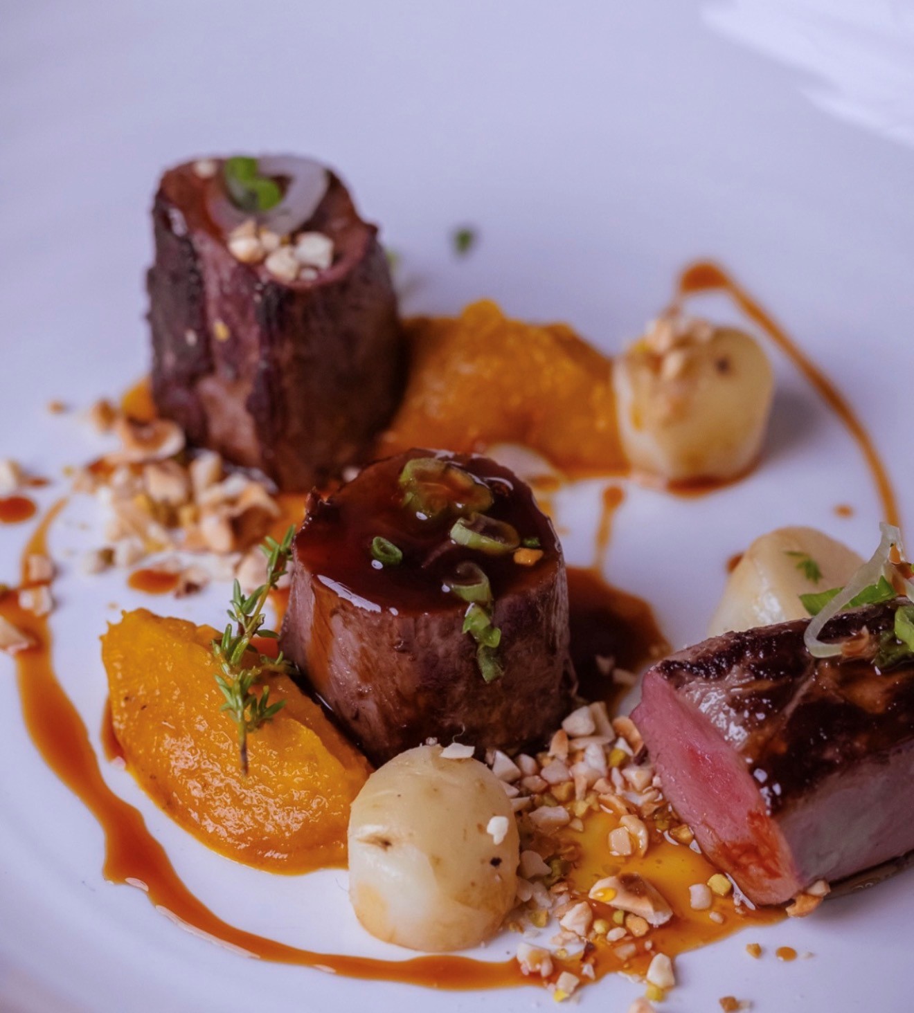 Braised beef ravioli on a Gressoney Toma cheese fondue