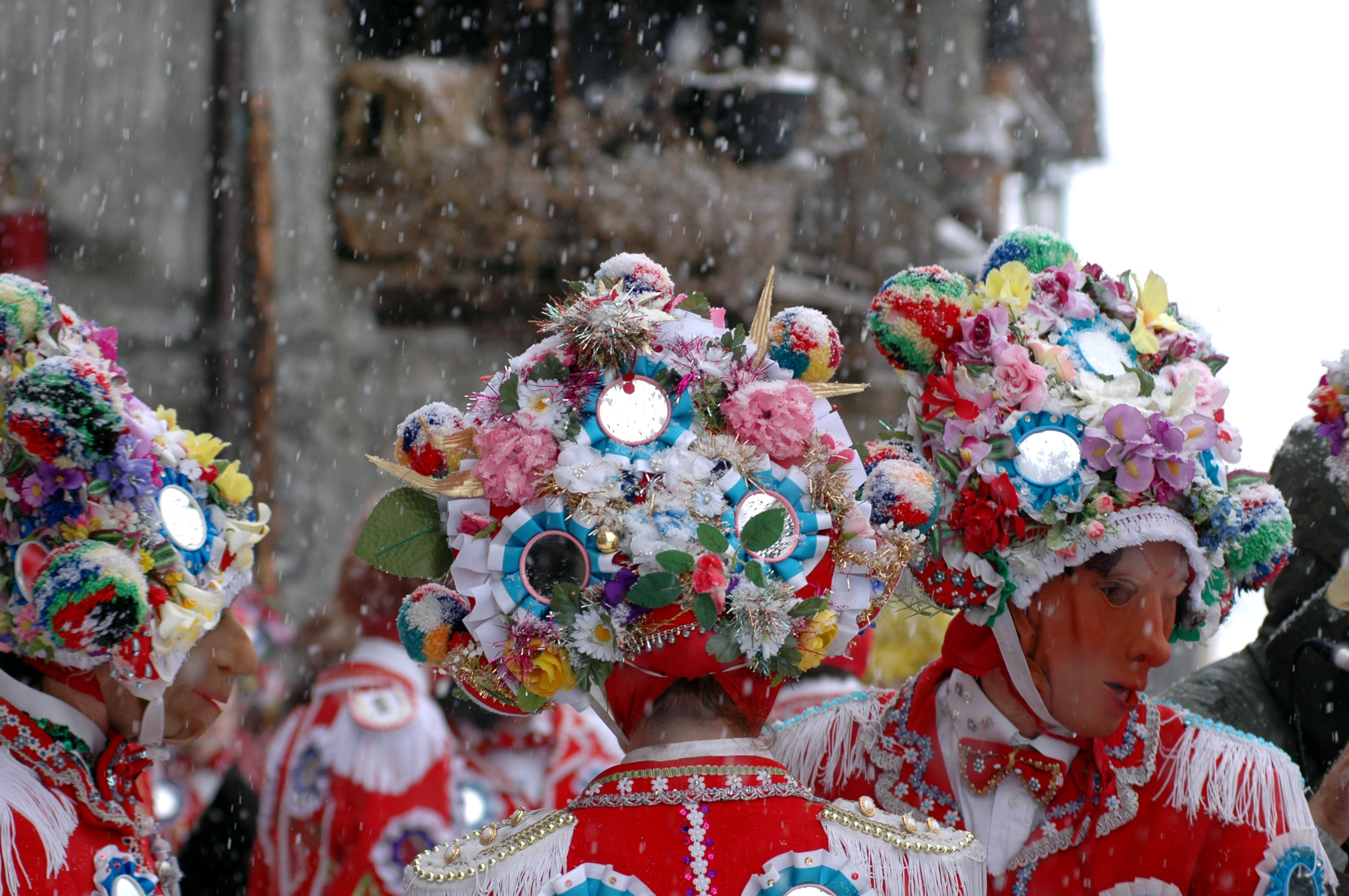 A bear is represented and symbolises the arrival of Spring; mule tails represent the winds and are used to banish baleful breezes; the mirrors on the costumes ward off evil spirits and the bright red colour, which symbolises vigour and strength, also has the power to dispel dark spirits, ill omens and misfortune. During the parade, the carnival characters enter the homes of local families; they dance along the streets and in the squares and eat and drink whatever they are given.