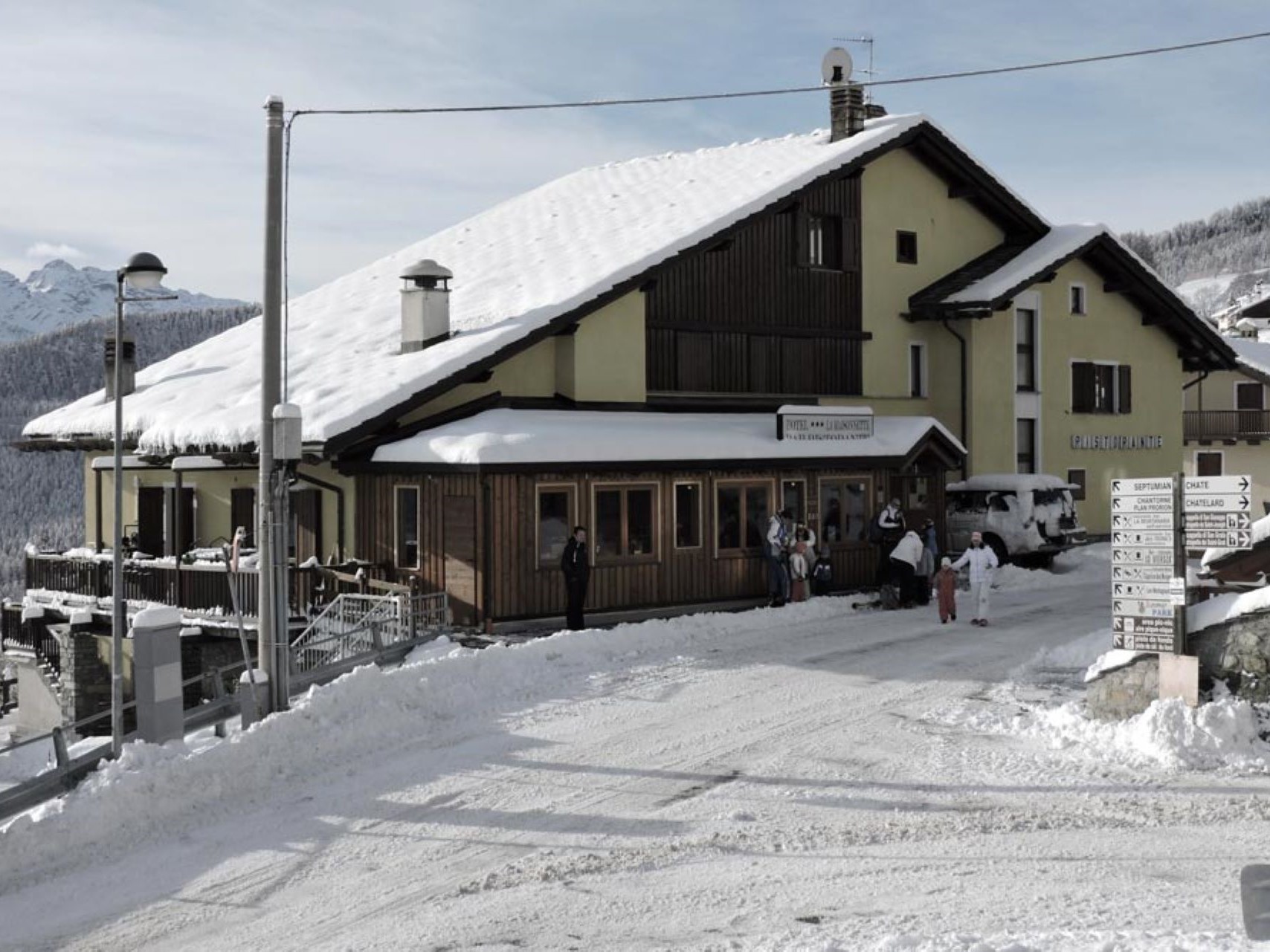 Follow the state road for about a kilometre until you come to a roundabout. Take a right for the regional road to Valtournenche and Cervinia, which arrives to the municipality of Antey-Saint-André after 7 kilometres. Here, drive to the left of the fork that leads up to Torgnon and after a few kilometres reaches the church and then the town. Pass the start of the ski lifts and the large car park and after a few bends you reach the Pecou hamlet. The hotel is immediately on the left.
