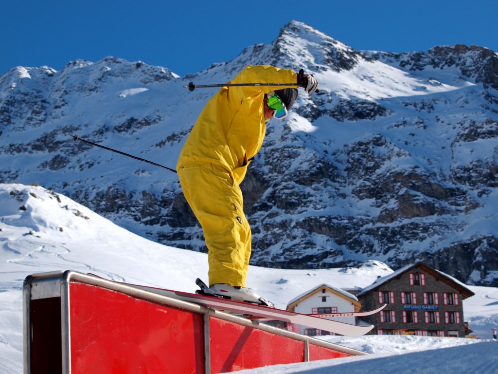 The snowpark of the Monterosa Ski area is located at 2,319 meters above sea level in Gabiet, Gressoney-La-Trinité.