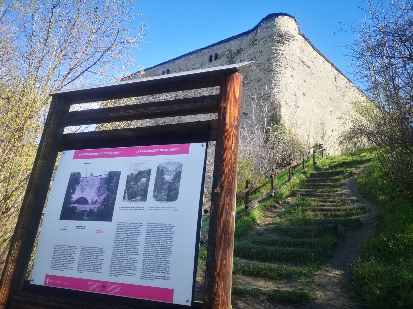 Along this route, visitors can appreciate the extraordinary medieval aqueduct-bridge of Grand-Arvou in Chiou di Porossan. This masterpiece in medieval plumbing and engineering was built upon order of Enrico di Quart, provost of the Aosta Cathedral, between the end of the 13th century and beginning of the 14th.