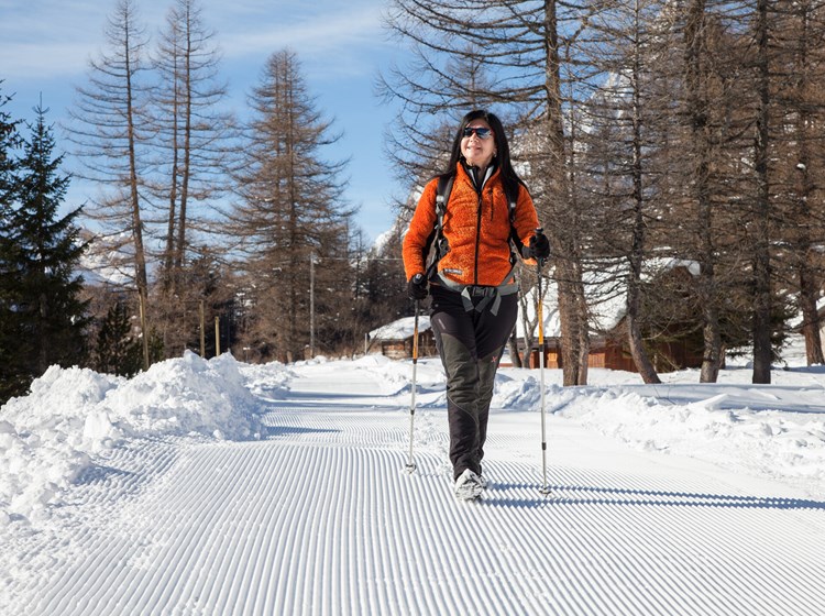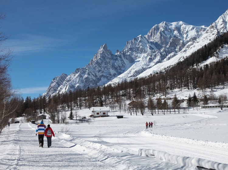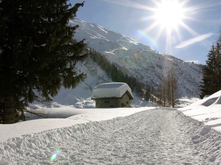 The pedestrian path on groomed snow starts from Planpincieux and winds for 3.5 km along the cross-country trails to Lavachey.