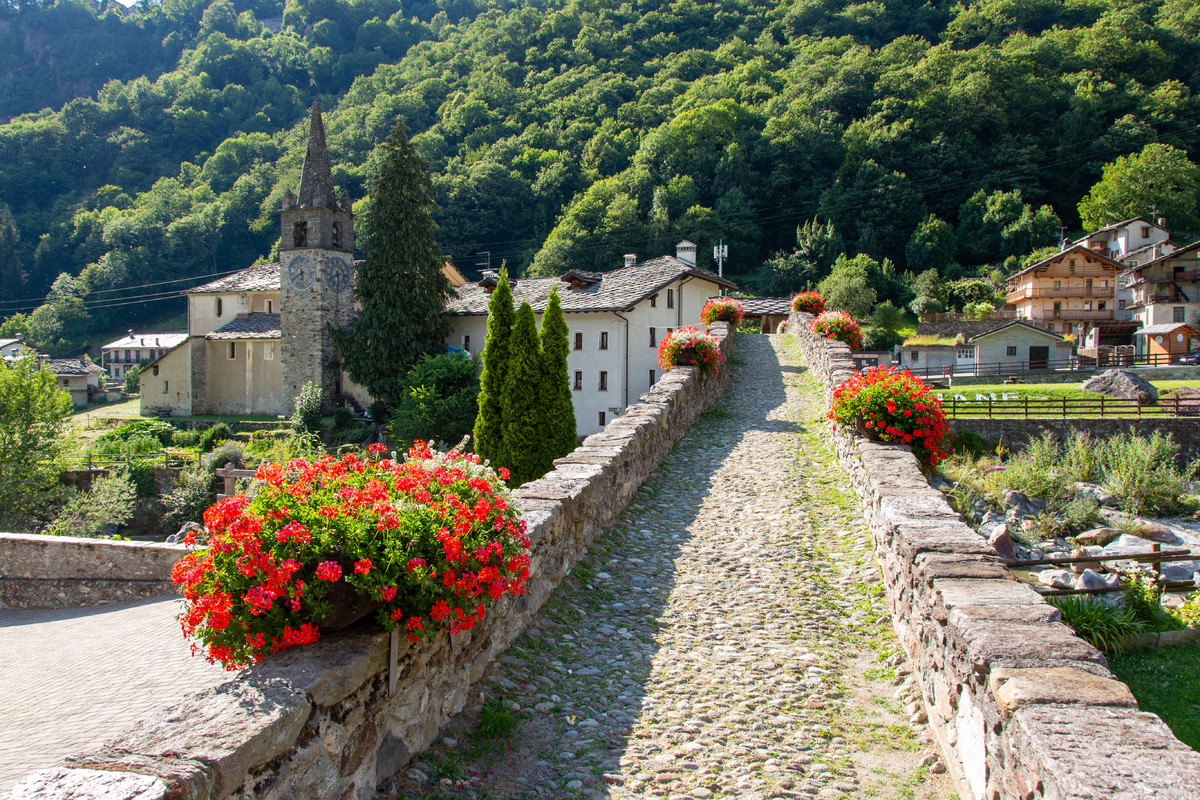 Surrounded by woods and traversed by the river Lys, Fontainemore greets visitors with its picturesque medieval bridge and the charming church of Sant’Antonio Abate, built on the rock beside the river.