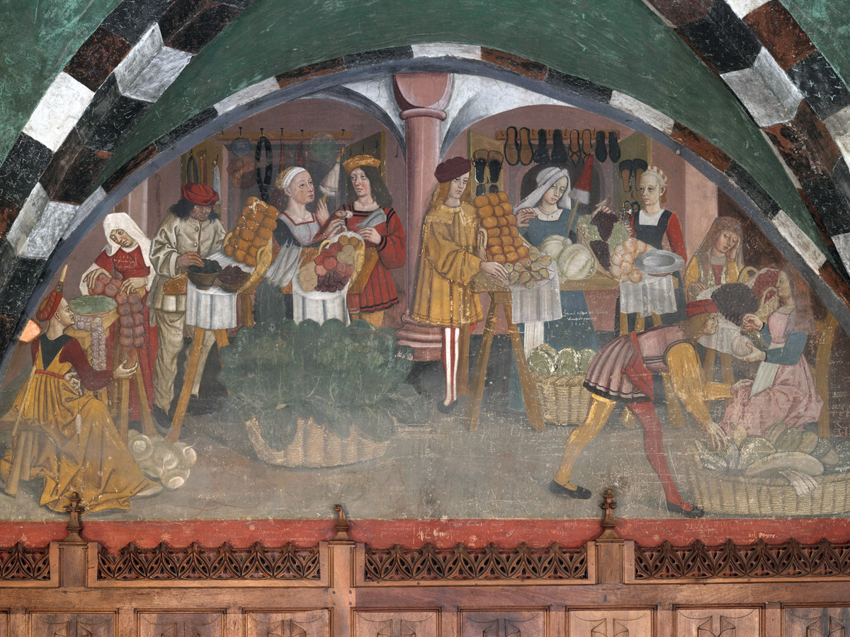 Then comes the hall frescoed with the famous “lunettes”, scenes from everyday life (the guards, the butcher and the baker, the greengrocer market, the tailor’s workshop, the pharmacy and the grocer).