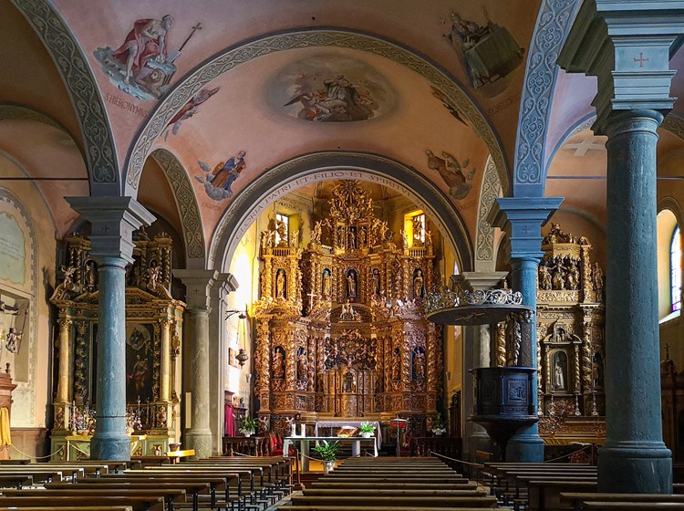 - Main altar: the fruit of various centuries of work (1500-1800), it is divided up horizontally into three strips. The central zone is from the beginning of the 18th century (but the five statues in the alcoves are certainly older and may be attributed to the 16th century). The lower and upper zones were created in 1713 by the carvers Gilardi and Minaldi from Valsesia. Around the middle of the 19th century, the parish priest Dandrès had the tabernacle remade. The altar was consecrated on the 29th of May 1716.