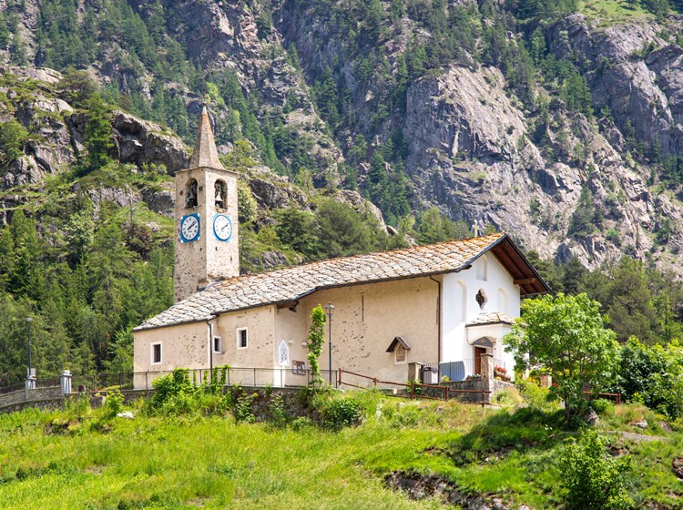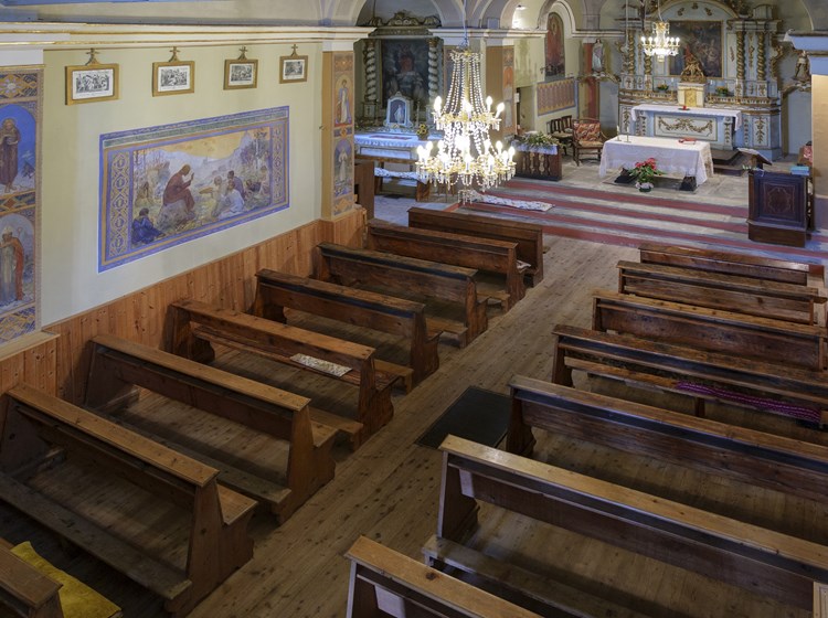 The interior of this church has curious frescos on eternit dating from 1914, they are the work of the painter Margotti. One of these shows the multiplication of the loaves, with Christ sitting in the area of Oyace called s-Ile. The main altar of the temple is in Baroque style, it does not however have the original angels which have been removed.