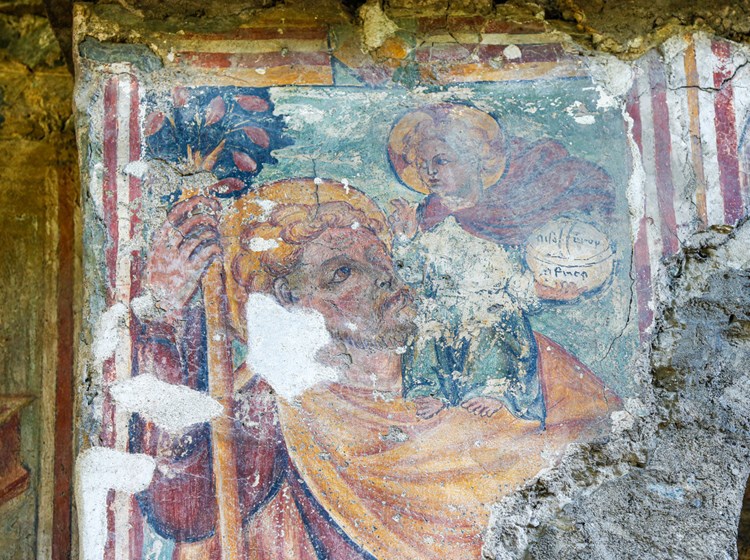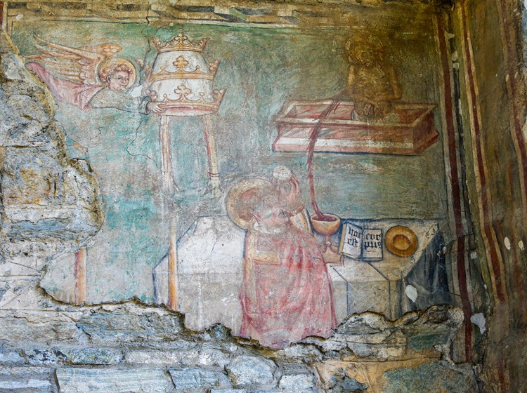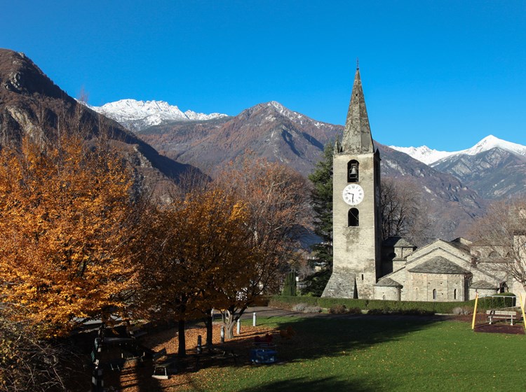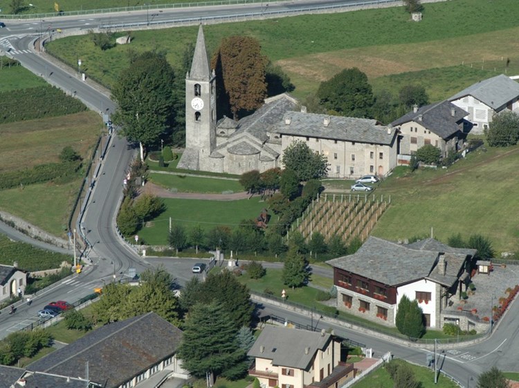 The Church of San Martino is located in the chief town of Arnad-Le-Vieux. The current building has a trapezoidal layout, with three naves that preserve a roof made of Gothic, low pointed cross vaults. The pillars support large arches that rest on capitals. The facade has a central tuff portal from the 15th century, decorated with a keel-shaped arch, representing two intertwined tree trunks with an overhead rose window. There are slender, single mullioned windows. The bell-tower, with a square shape, has a high, pyramid-shaped spire. The ceiling on the left nave is decorated with Late Gothic frescoes. The subjects represented include “St. George fighting a dragon”, the “Feast of Herod”, a “Crucifixion” and the “Beheading of John the Baptist”.