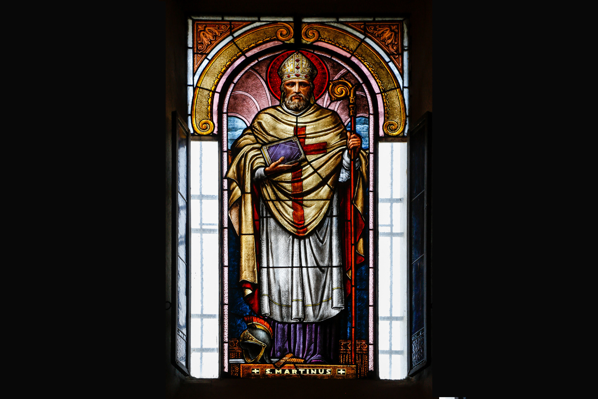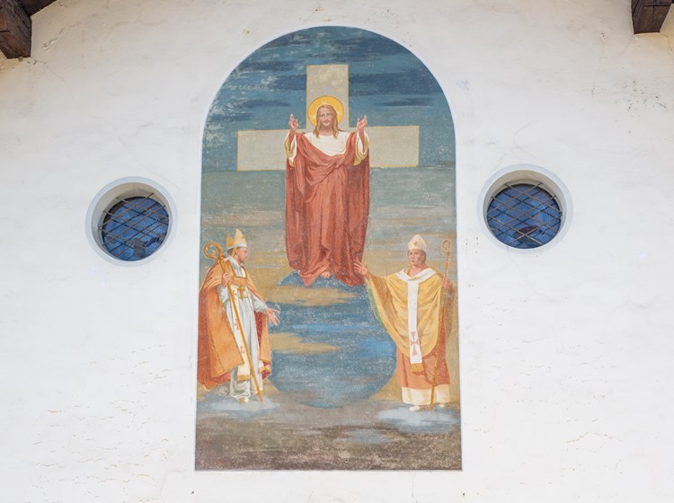 On the façade, a 1968 fresco (Nino Pirlato) depicts Christ between Saint Leodegar and Saint Martin.