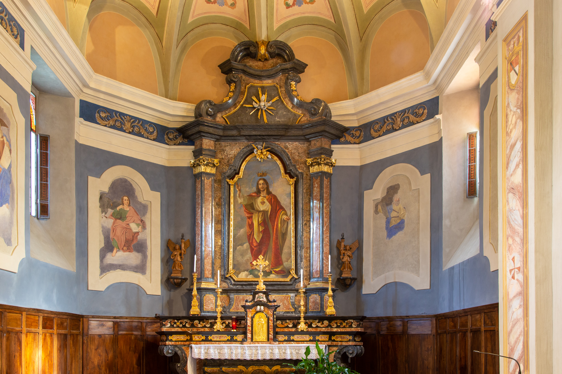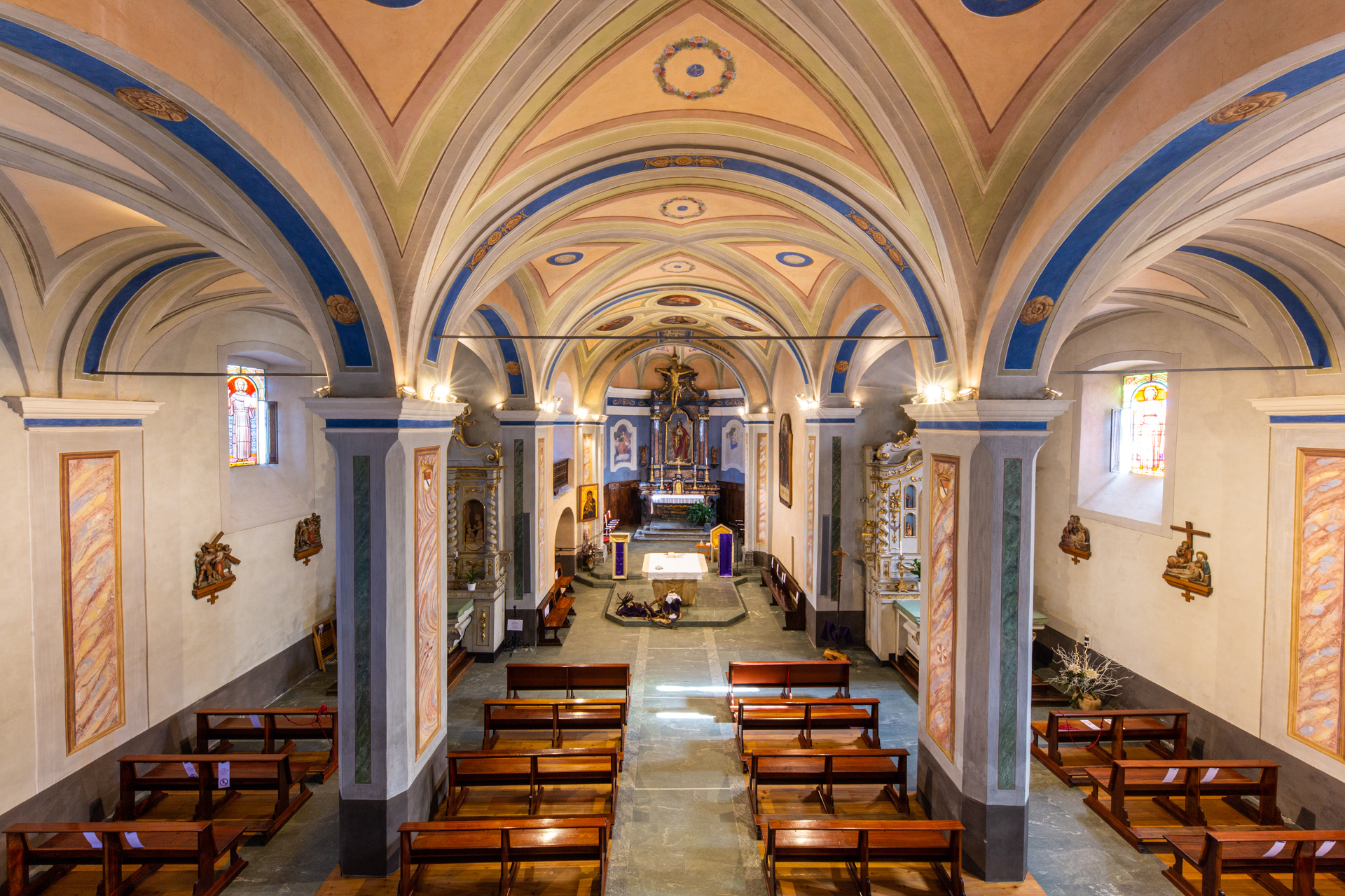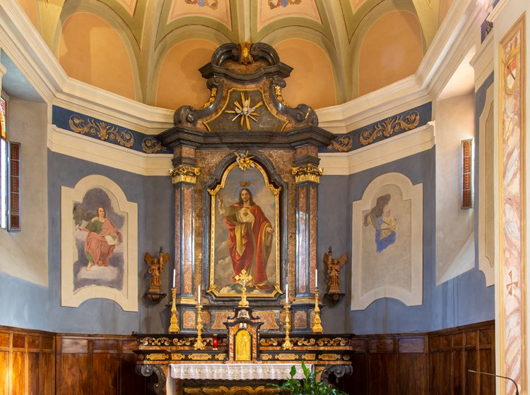The main altar was built by the brothers Giuseppe and Giacomo Ferrario, sculptors from Arzo (Lugano), in the years 1764-1766; the organ (1881) is by the Collino brothers. The stained glass windows depicting some saints are also interesting.