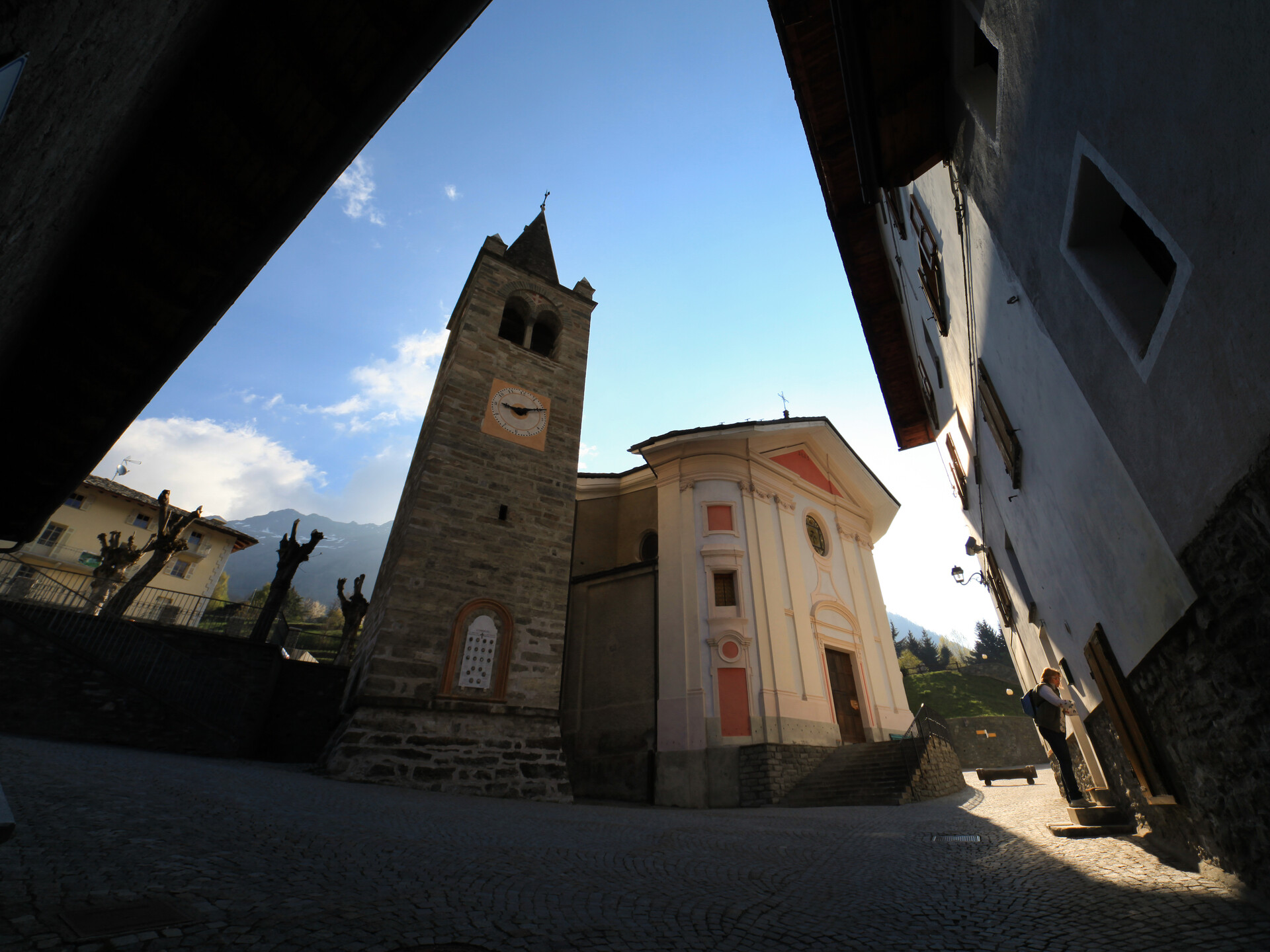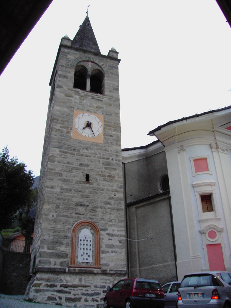 The early parish church was built in the same place as the current one, but faced in an East-West direction, with the altar to the east. Entry was through a door in the bell-tower, which is now separate from the church. Due to the reduced dimensions and its state of decline, it was demolished and replaced by the current church, built in 1814, with an altar placed to the north. The bell-tower was built in 1480 by Yolli de Vuetto, a master mason in Gressoney, who also built the bell-tower in Gignod between 1481 and 1485.