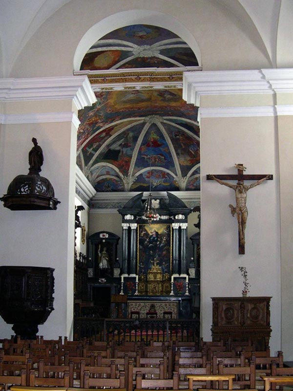 The walls are decorated with frescoes painted in 1862 by Ivrea painter Giuseppe Stornone. Also of special value is the 18th-century carved and gilded altar placed in the right side chapel.