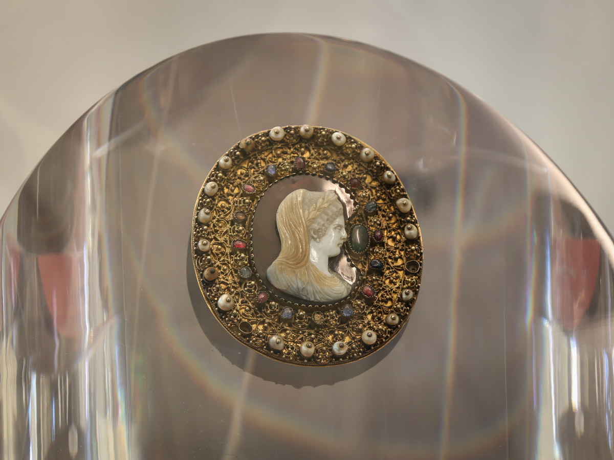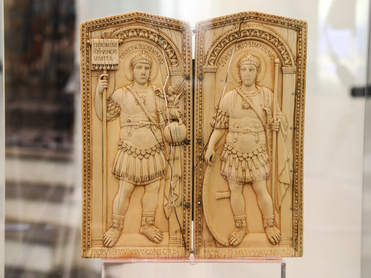 The most precious examples include a chimney from the Roman era with precious stones and pearls set in a gold frame from the 13th century, used as a cope buckle; the unique pieces include the diptych of Honorius, testimony of late Roman art.