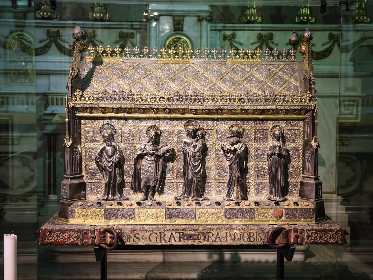The rich gold collection contains French items of Limousin art, precious silver relic busts with inscriptions and set with crystals and precious stones. Outstanding pieces include the large relic chest of Saint Gratus, which was created by William of Locana and, after his death, was entrusted to the Flemish sculptor Jean de Malines.