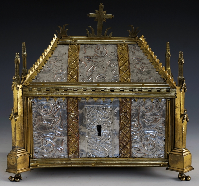 In the three cases placed under the matroneum on the right side, among the goldsmith’s crafts, three chalices dating back to the first decades of the 15th century are worthy to see. One of them, in silver, has got under his foot, the trademark of an unknown goldsmith, whose hand is also recognizable in the chalice of the Courmayeur’s church, realized in 1410; the special shape of the foot and the adorned knot are typical of the sacred pot spread in the alpine zone, between the French Savoie, the Aosta Valley end the Swiss canton of Vaud. A processional cross of the beginning of the 15th century is clad with iron leaves covered by silver and gold and orned, at the end of his arms, by the representation of the Blessed Virgin, Saint John Evangelist, the mystic pelican and the evangelists. The reliquary of the middle 15th century is covered by iron leaves decorated with flowers, like the reliquary of the Holy Grato in the Aosta cathedral, finished in 1458.