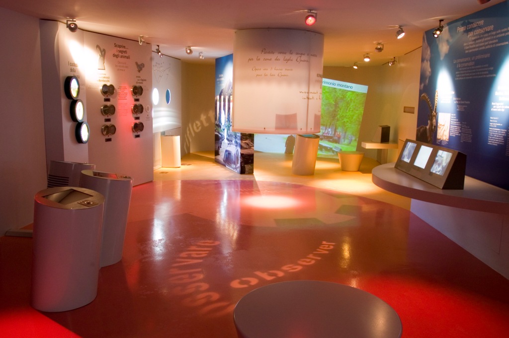 The Visitor Center of the Gran Paradiso National Park of Cogne Laboratory Park presents the complex and dynamic evolution of the protected area as in a laboratory of experimentation: explanatory models, multimedia systems, interactive games and an original “sensory space” that offers visitors the opportunity to appreciate the scents of nature and hear the characteristic sounds of the woods.