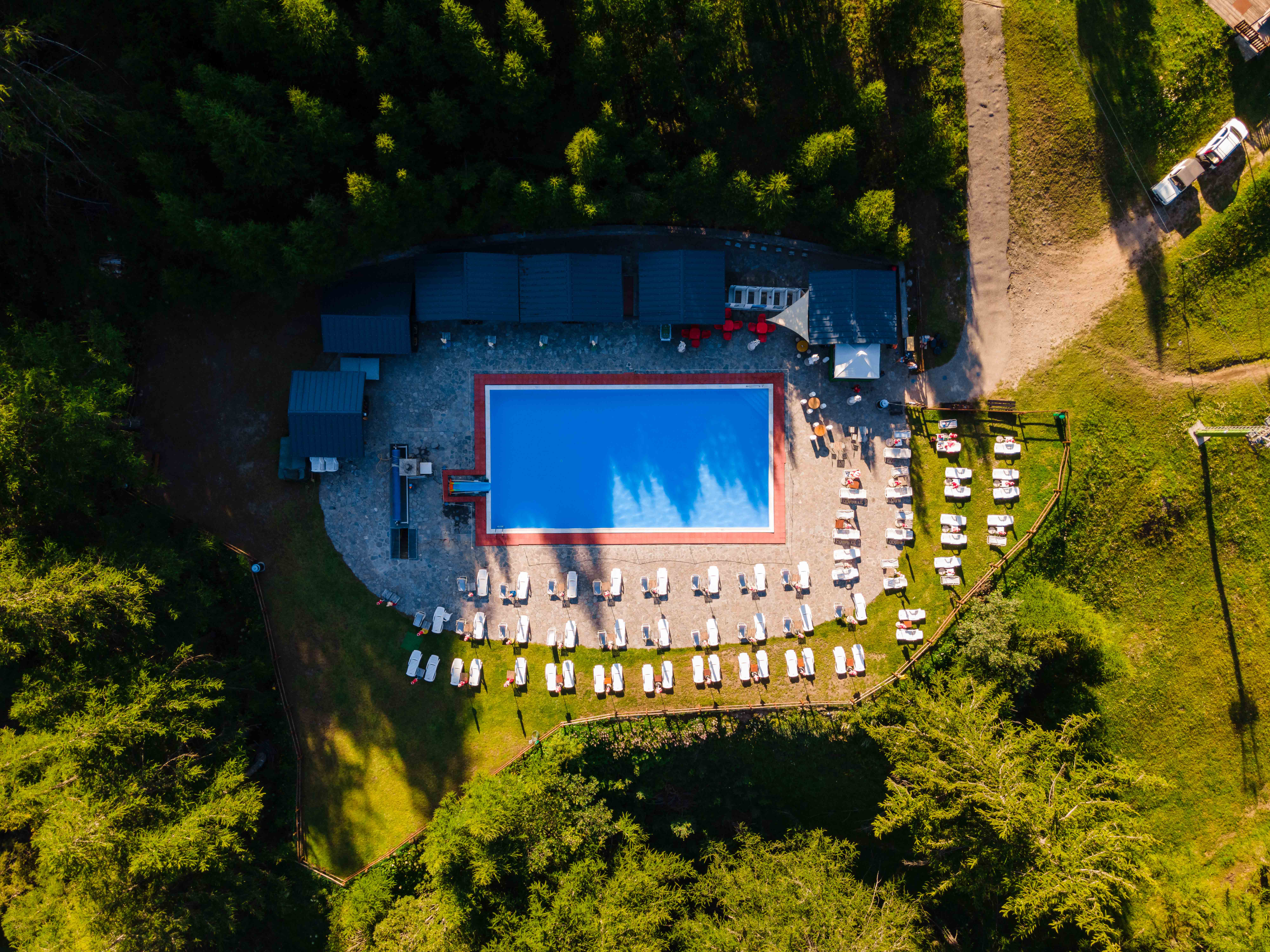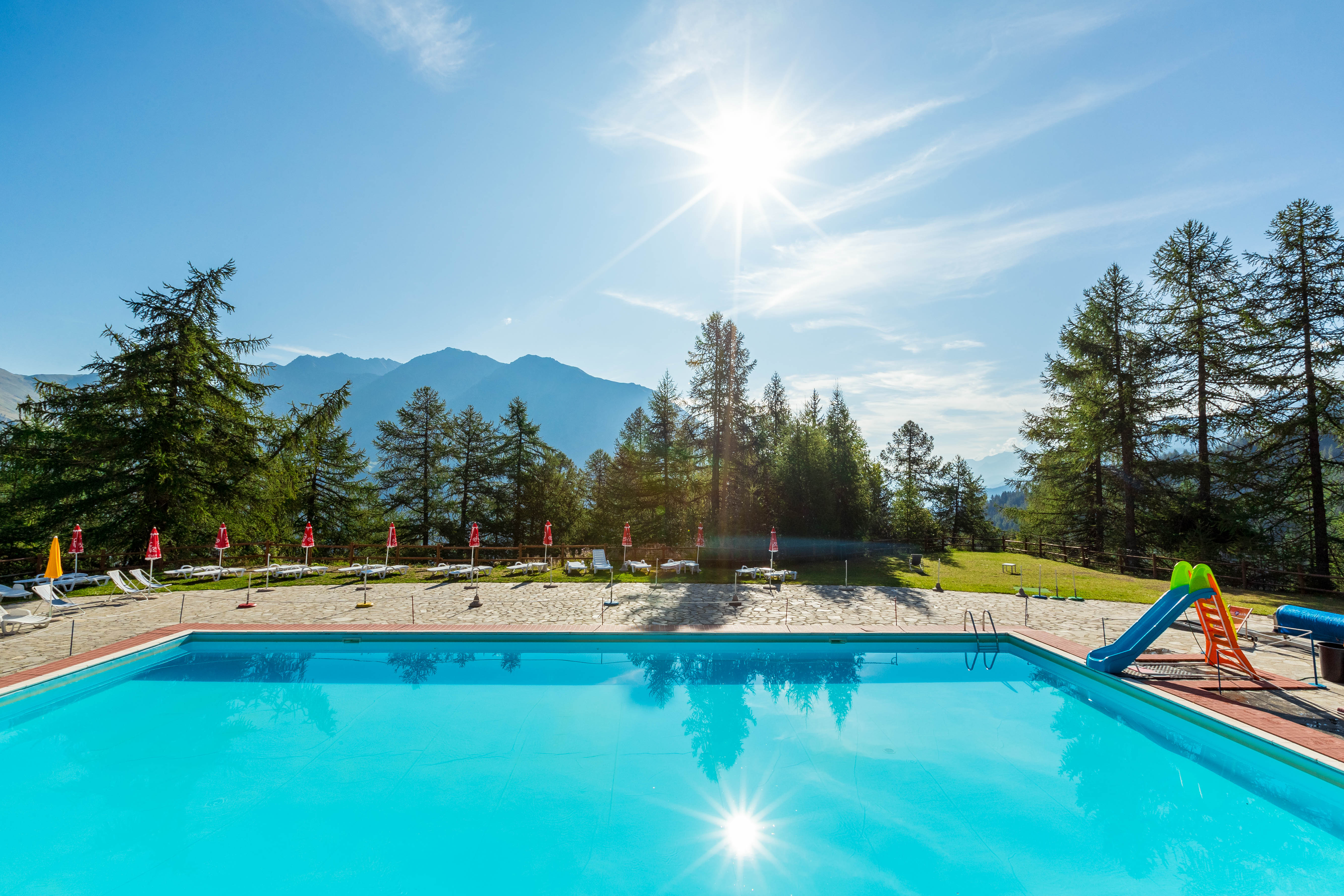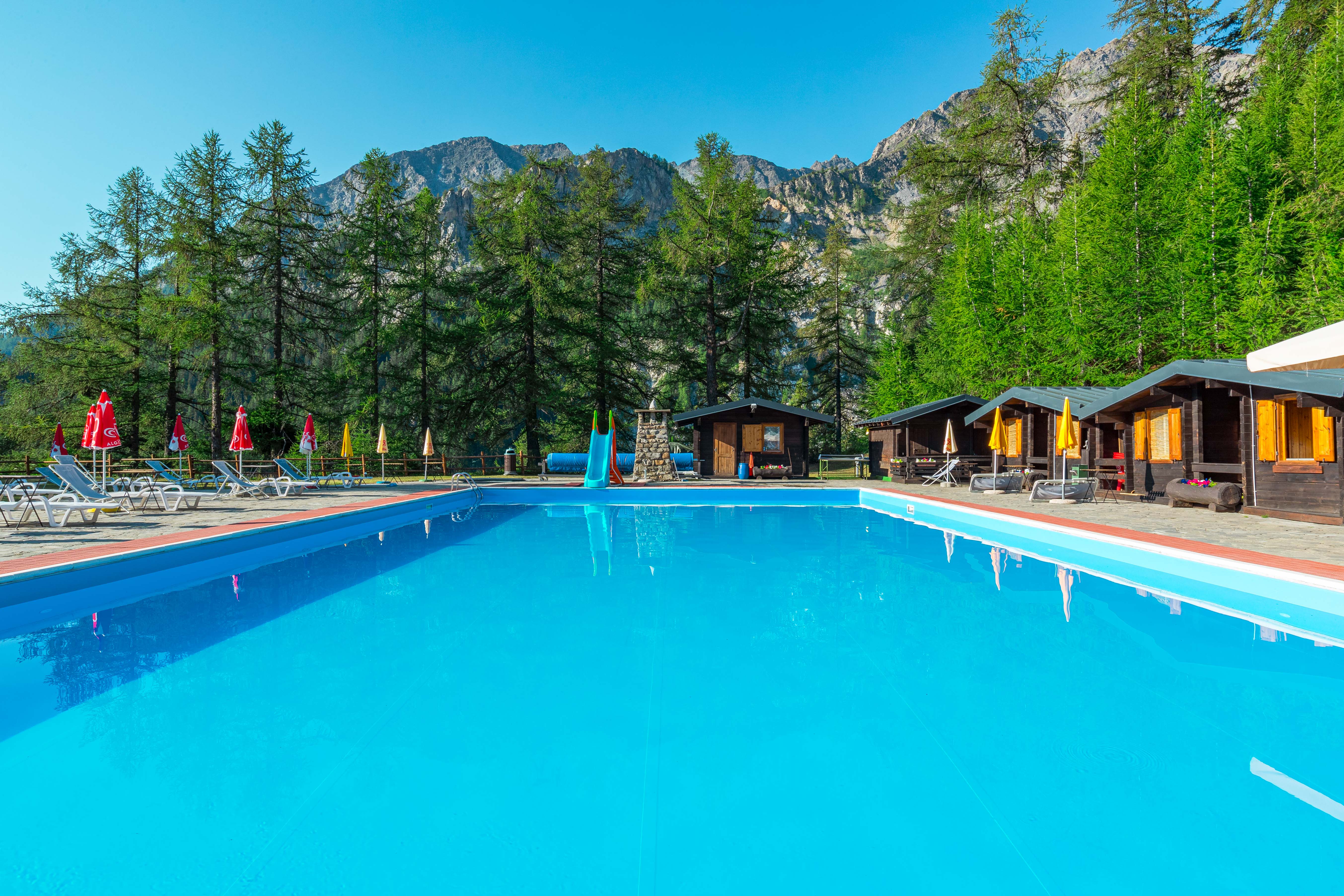 The alpine pool is 20 m long. and 1.50 m deep with the water heated between 27 and 30°, and it is located in green prairies.