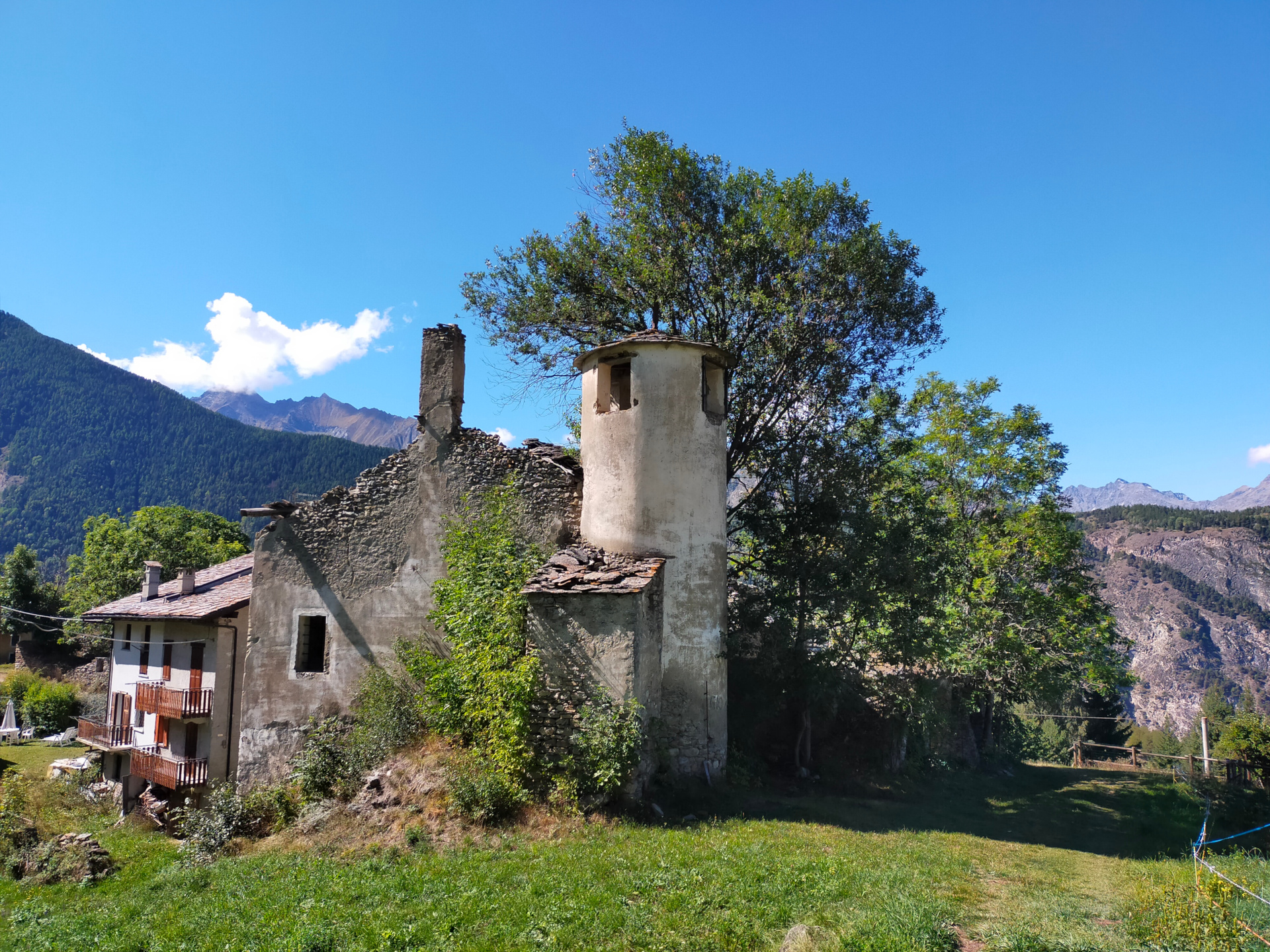 L’édifice privé est aujourd’hui en ruine et on y accède en empruntant la petite route à gauche par rapport à l’église d’Ozein.