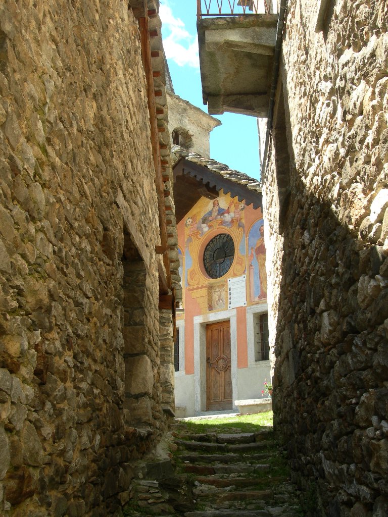 Serrées les unes aux autres, les maisons forment des ensembles complexes, séparés par des passages couverts, des terrasses, des jardins et des venelles, qui permettent de découvrir une architecture ancienne de qualité, où les espaces intérieurs et extérieurs ont un visage humain et reflètent le savoir-vivre montagnard.