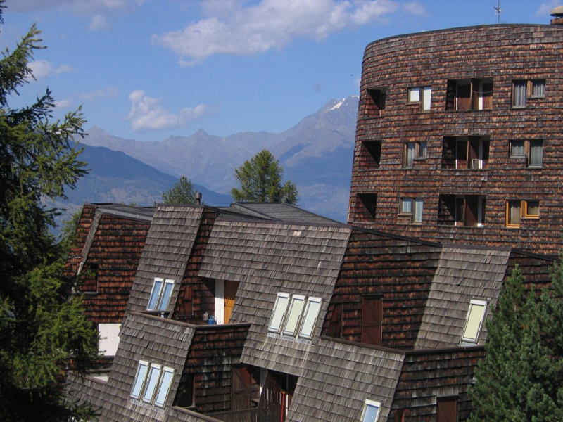 Les principaux bâtiments sont disposés en rond au-dessus d’une route couverte, qui cache la circulation à la vue et la protège de la neige et du gel. Les hôtels se dressent hors du sol alors que la plupart des logements privés sont en sous-sol, en cascade, sur les pentes du ponant vers le panorama du Mont Blanc. Le complexe s’adapte et se modèle en fonction de l’orographie de l’agglomération et ses couleurs se fondent avec celles de la nature. La typologie des appartements reprend les concepts développés par Le Corbusier dans ses unités d’habitation : des logements étroits côte à côte, de type studio ou duplex, séparés par de longs couloirs aveugles, avec de grandes baies vitrées donnant sur le panorama.