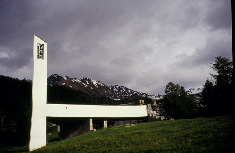 Le bâtiment religieux (1989-2000), placé sur un bloc rocheux en face du complexe principal, présente des formes simples : deux bandes blanches qui sortent du terrain et convergent en entonnoir vers un campanile composé de deux lames de béton.