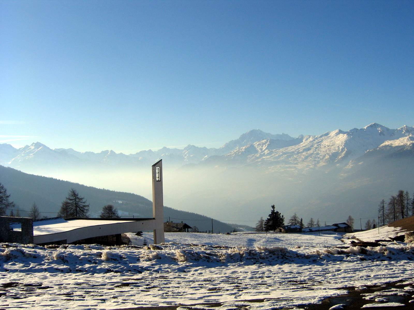 Le bâtiment religieux (1989-2000), placé sur un bloc rocheux en face du complexe principal, présente des formes simples : deux bandes blanches qui sortent du terrain et convergent en entonnoir vers un campanile composé de deux lames de béton.