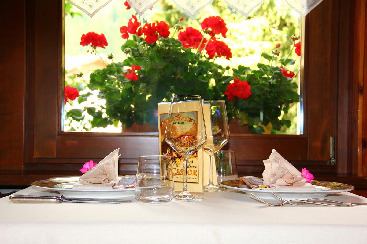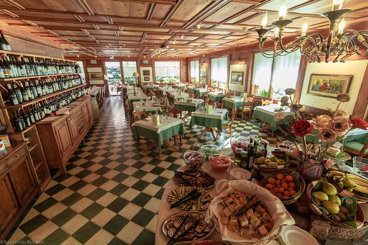 La salle très spacieuse, en bois de mélèze, donne à l’hôtel le signe distinctif de son style montagnard élégant.