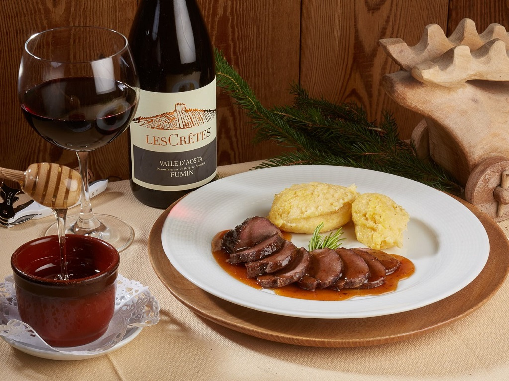 La cuisine, authentique et naturelle, est supervisée directement par les propriétaires, chaque jour vous pourrez déguster un plat typique de la tradition de la Vallée d’Aoste; la salle à manger, grande et lumineuse, est caractérisée par d’innombrables trophées de chasse, d’où le nom de l’hôtel.
