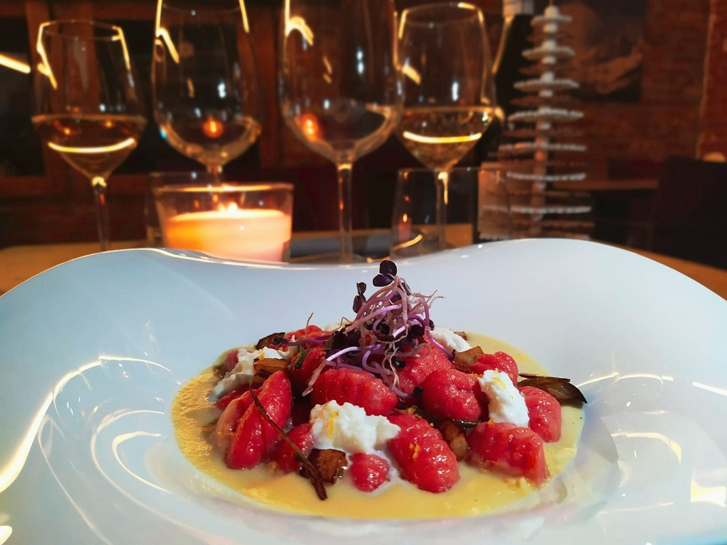 Gnocchi de betterave rouge à la crème de chou jaune, stracciatella de buffle et écorce de féminello