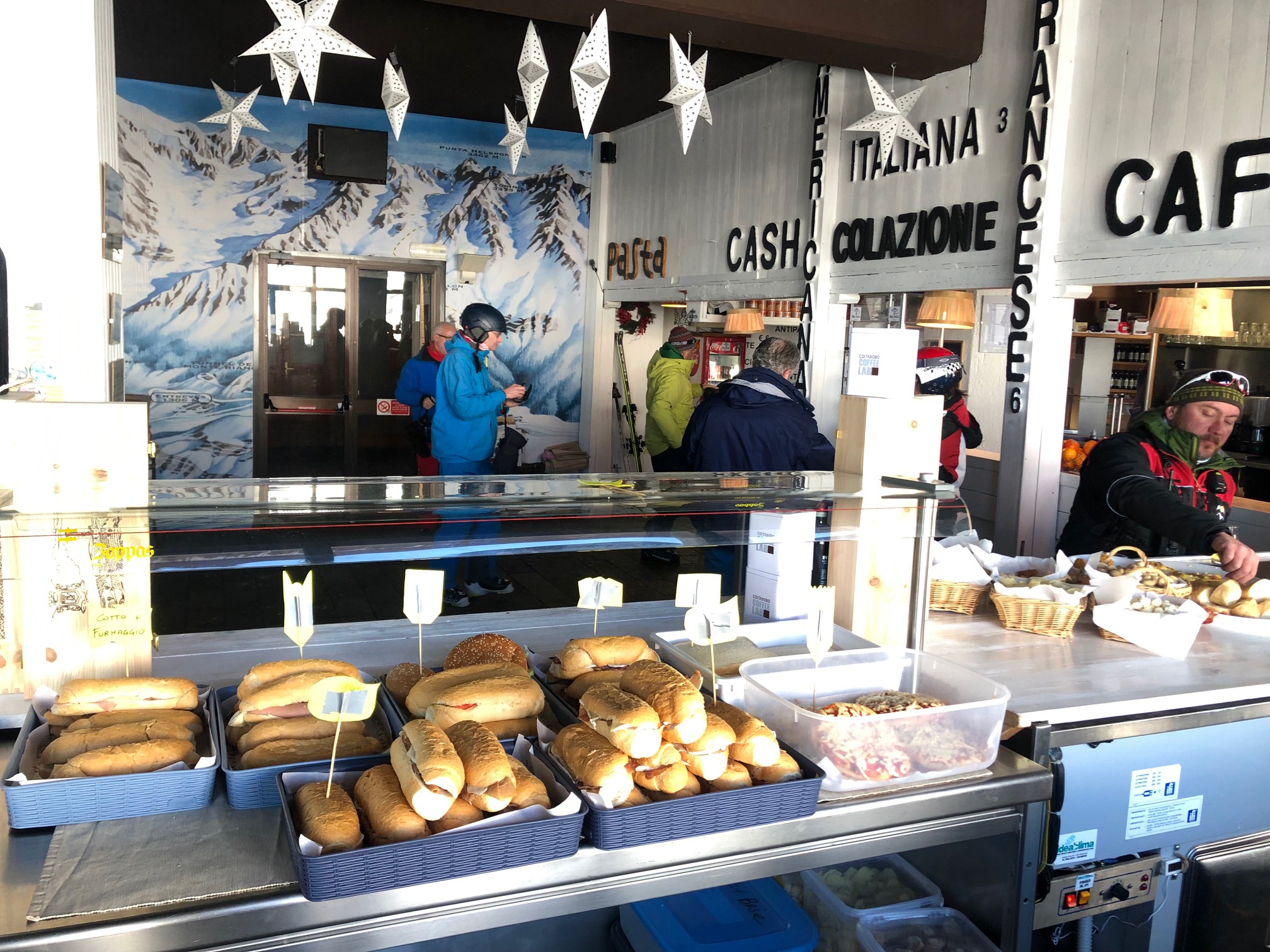 Restaurant self-service, bar. Terrasse sur le Mont Blanc, restaurant le plus haut de Courmayeur. Spécialités valdôtaines et de la Venétie.