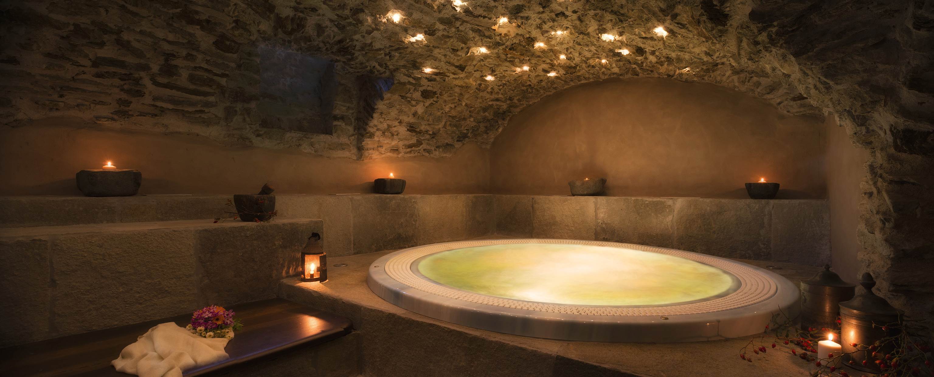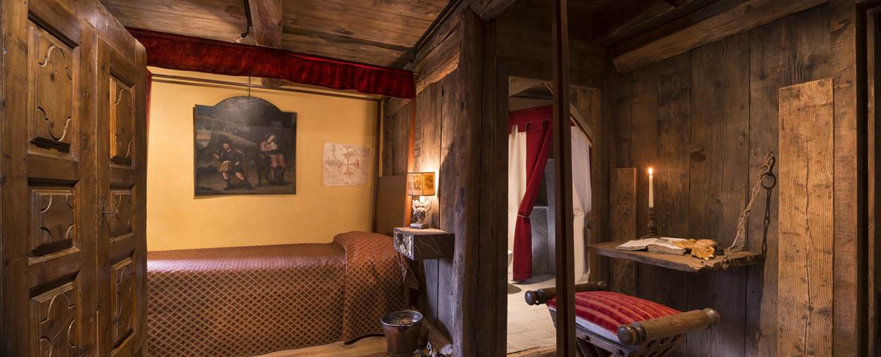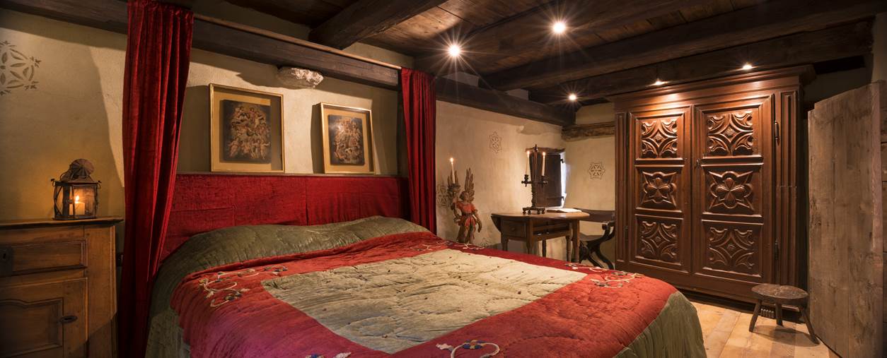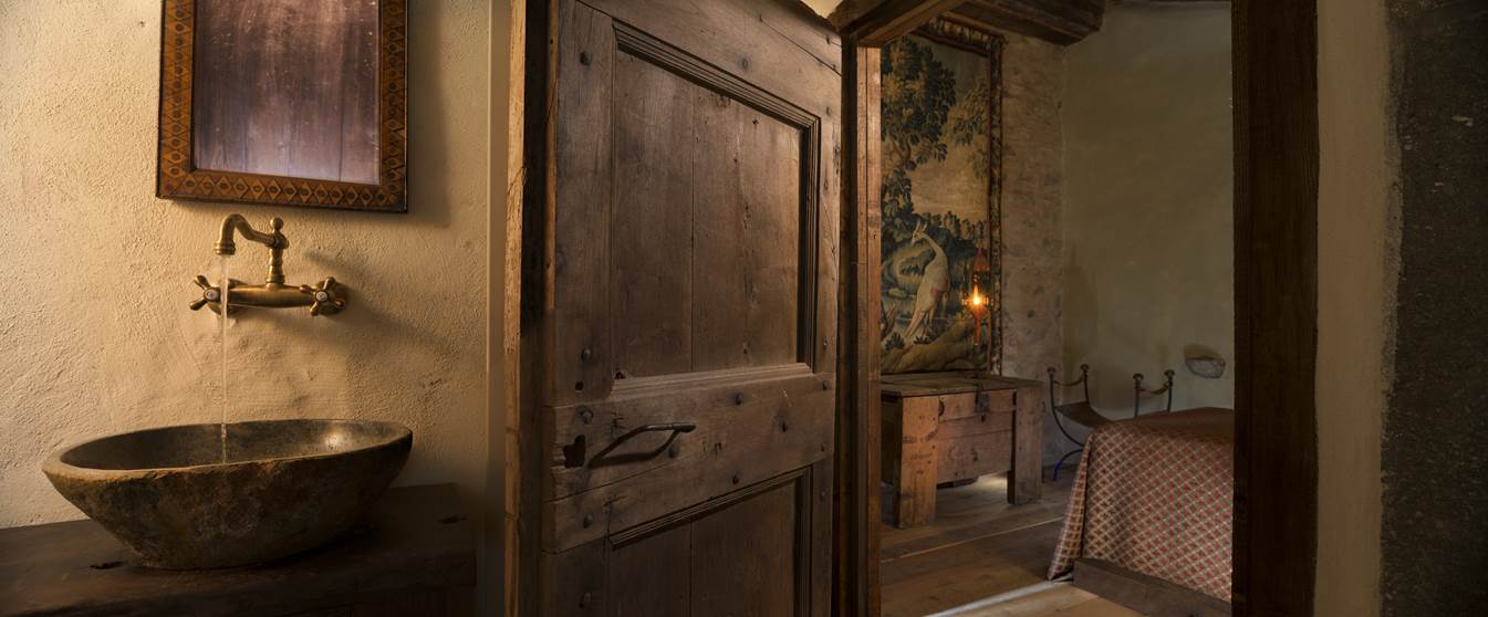 Mobilier, peintures, sculptures et objets présents dans chaque chambre ont une origine ancienne. Les lits, modernes et confortables, sont recouverts de tissus dont les couleurs créent une ambiance d’époque. Dans la salle de bains, la cabine de douche a été remplacée par des parois de pierre et des rideaux imperméables qui rappellent les tentes médiévales de camp, avec cantonnière décorée. Le lavabo est en pierre, le robinet en laiton.