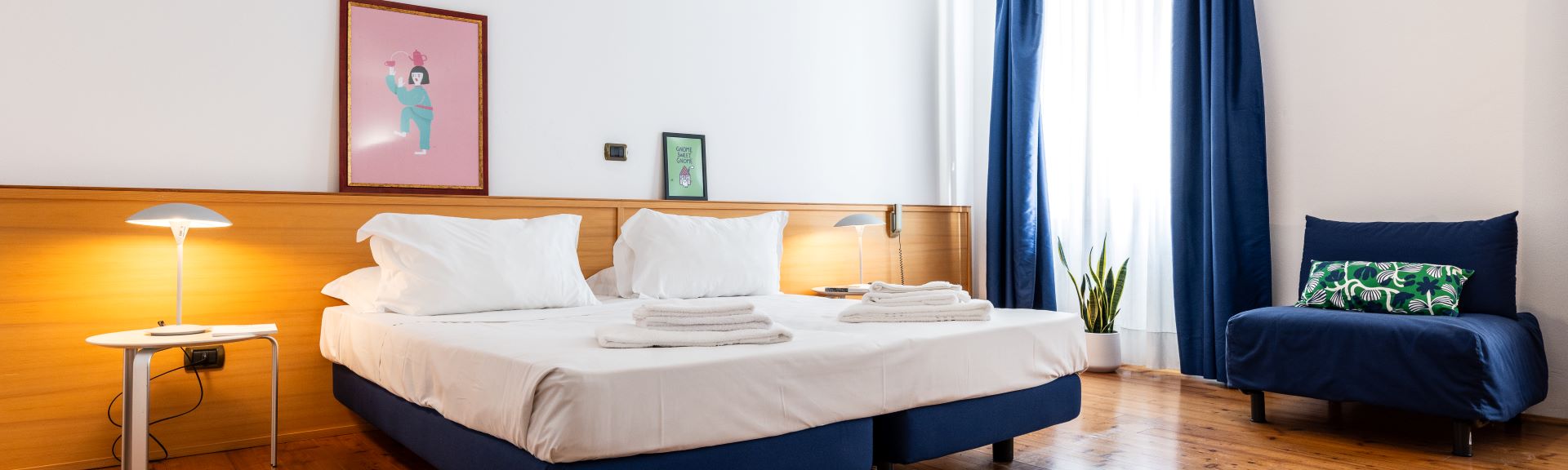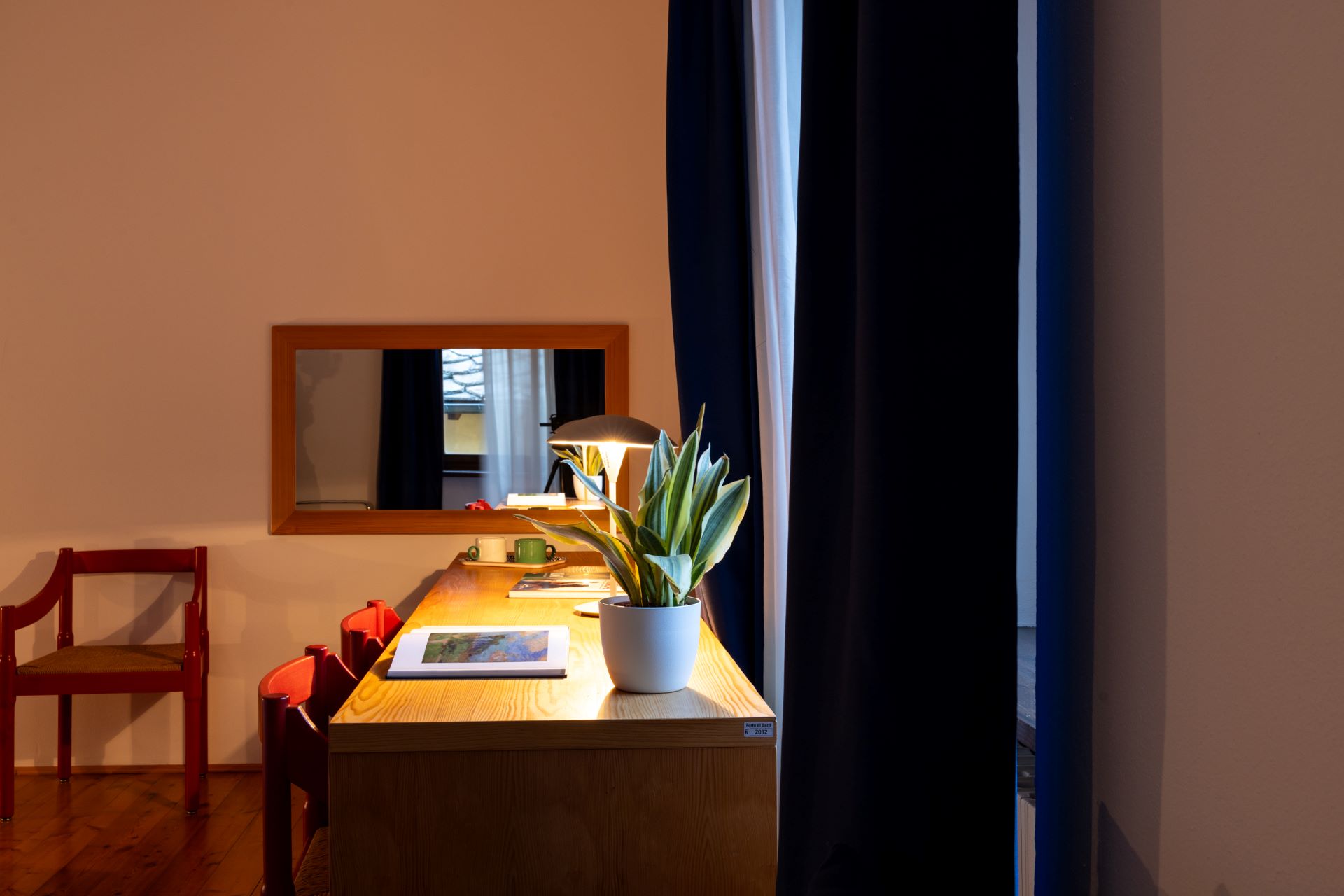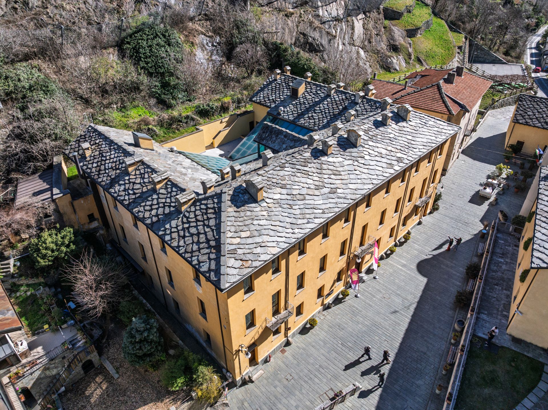 La structure propose des chambres doubles et triples – transformables en quadruples – spacieuses, accueillantes et lumineuses, toutes équipées d'une salle de bain privée, d'un mobilier design et soignées dans les moindres détails. Le parquet d'origine et la lumière qui filtre à travers les grandes fenêtres créent des ambiances chaleureuses et accueillantes, avec une vue imprenable sur le village de Bard. Au cœur du bâtiment se trouve également un espace théâtral, élément distinctif qui allie accueil et création artistique. À proximité immédiate, vous trouverez des espaces verts, une aire de jeux et des fontaines, parfaits pour les familles.