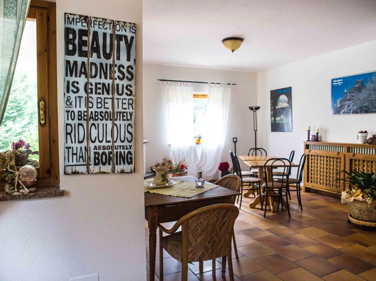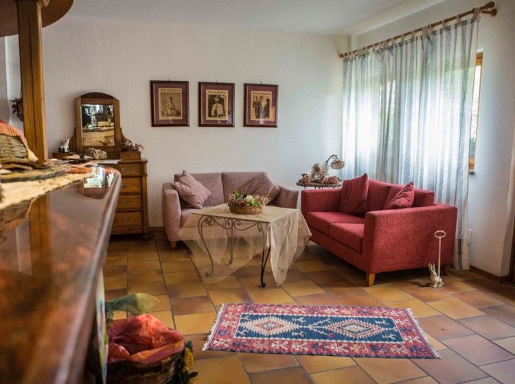 Le salon, la salle de cheminée, le bar et les baies vitrées avec vue sur le parc sont décorées avec goût, selon la tradition valdôtaine.