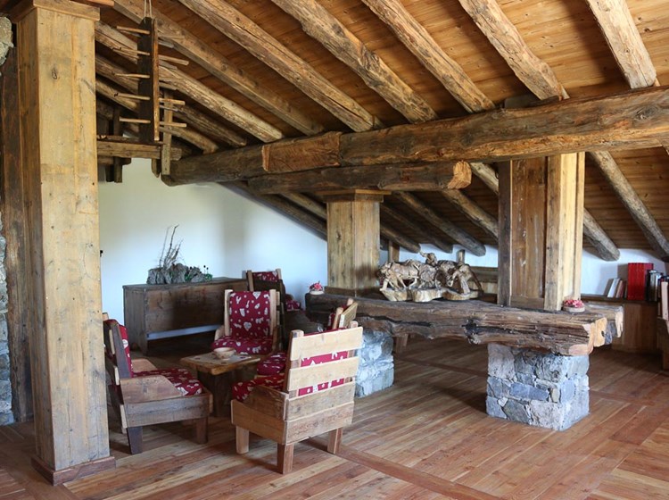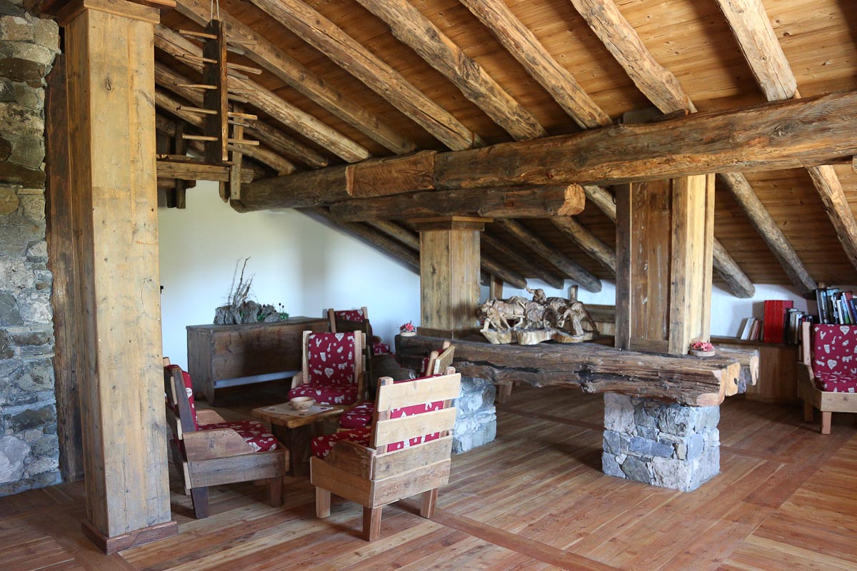 Le refuge est une structure récente aux allures de chalet de montagne traditionnel. L’intérieur et l’extérieur ont été construits avec du vieux bois inutilisé. L’attention aux détails ainsi que les œuvres d’art de Siro Viérin le rendent unique.