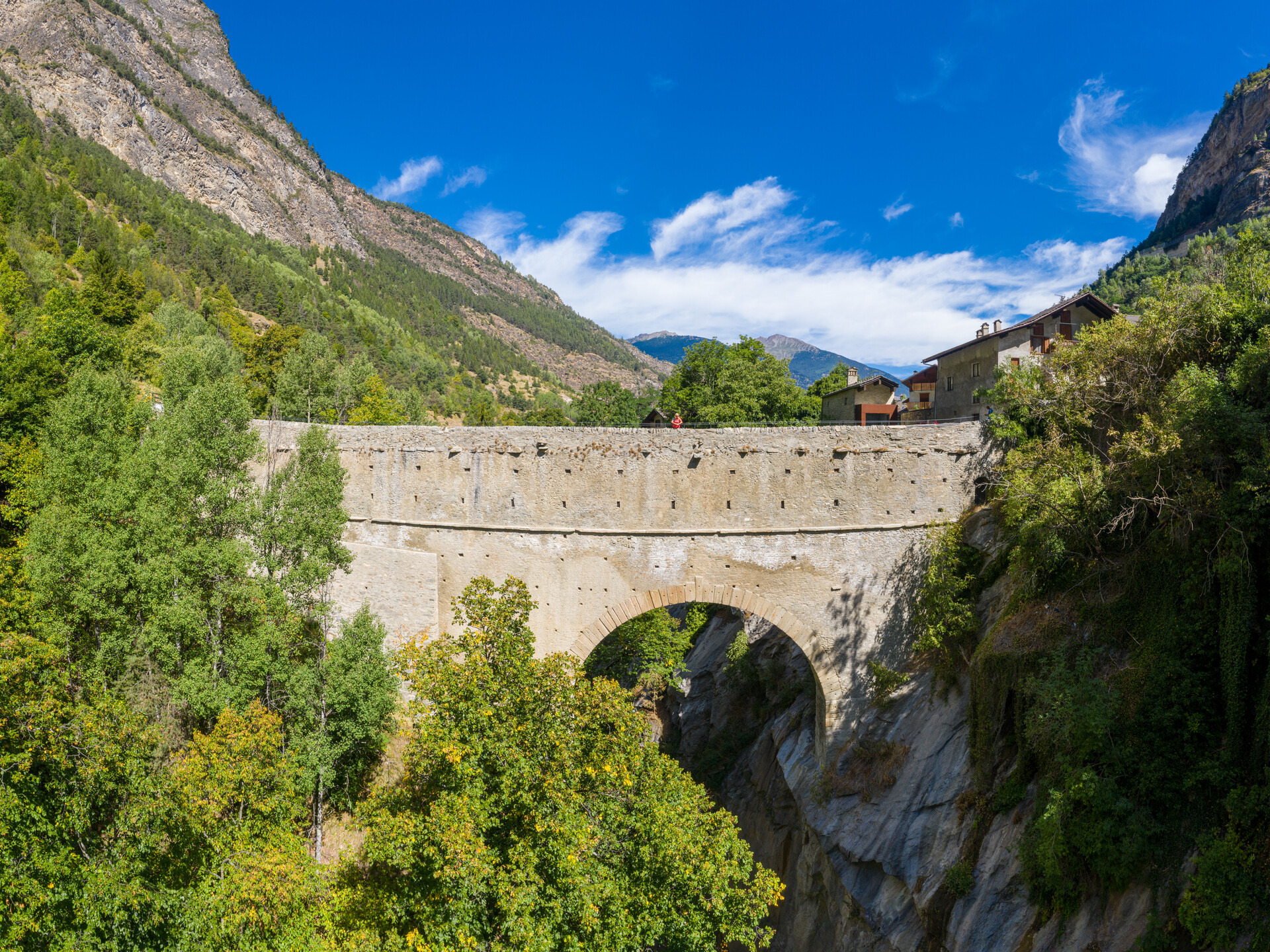 ● Le pont-aqueduc romain de Pont d'Aël, une grandiose œuvre de maçonnerie romaine, suspendue à 56 mètres sur le torrent Grand Eyvia,.