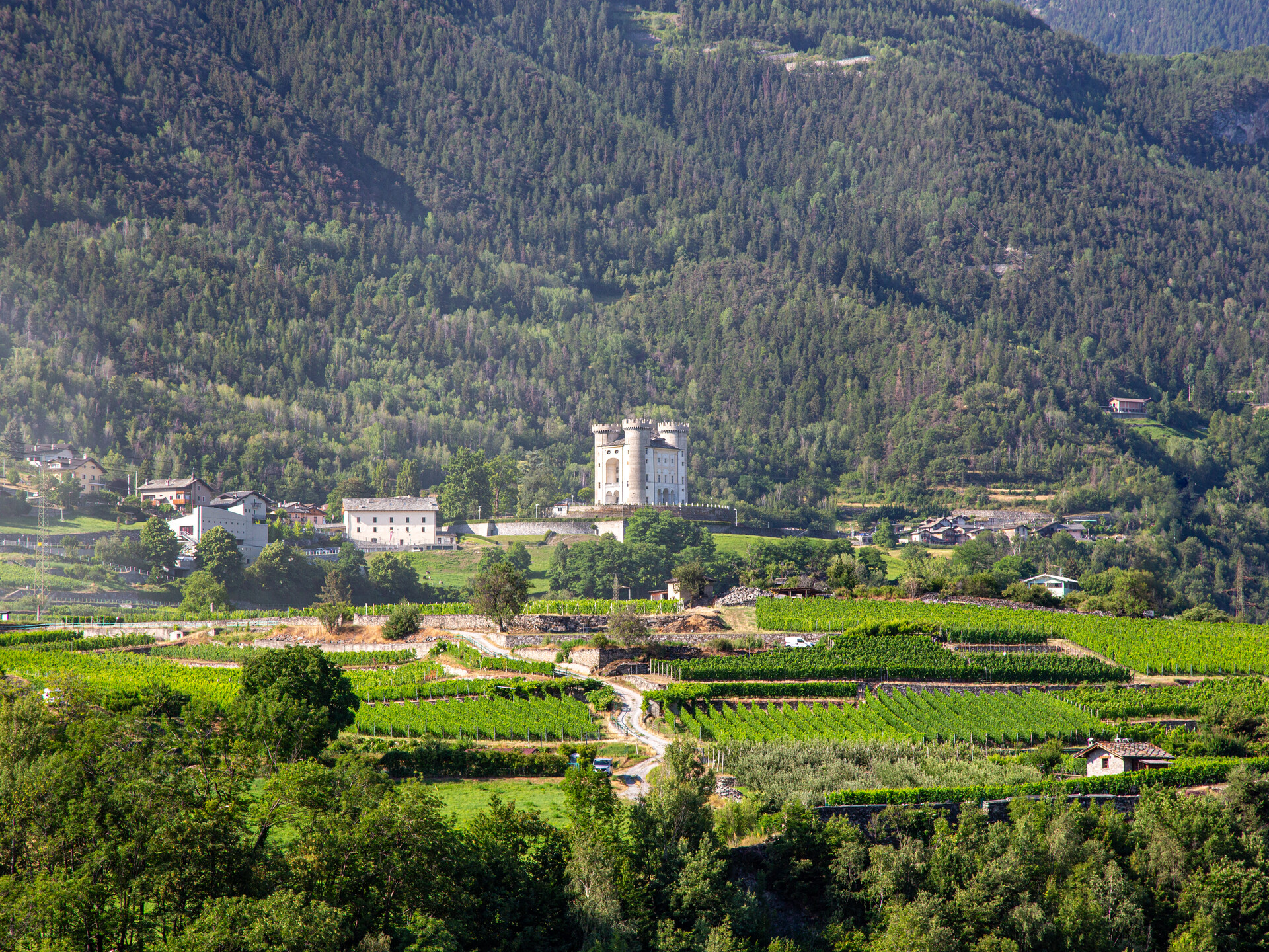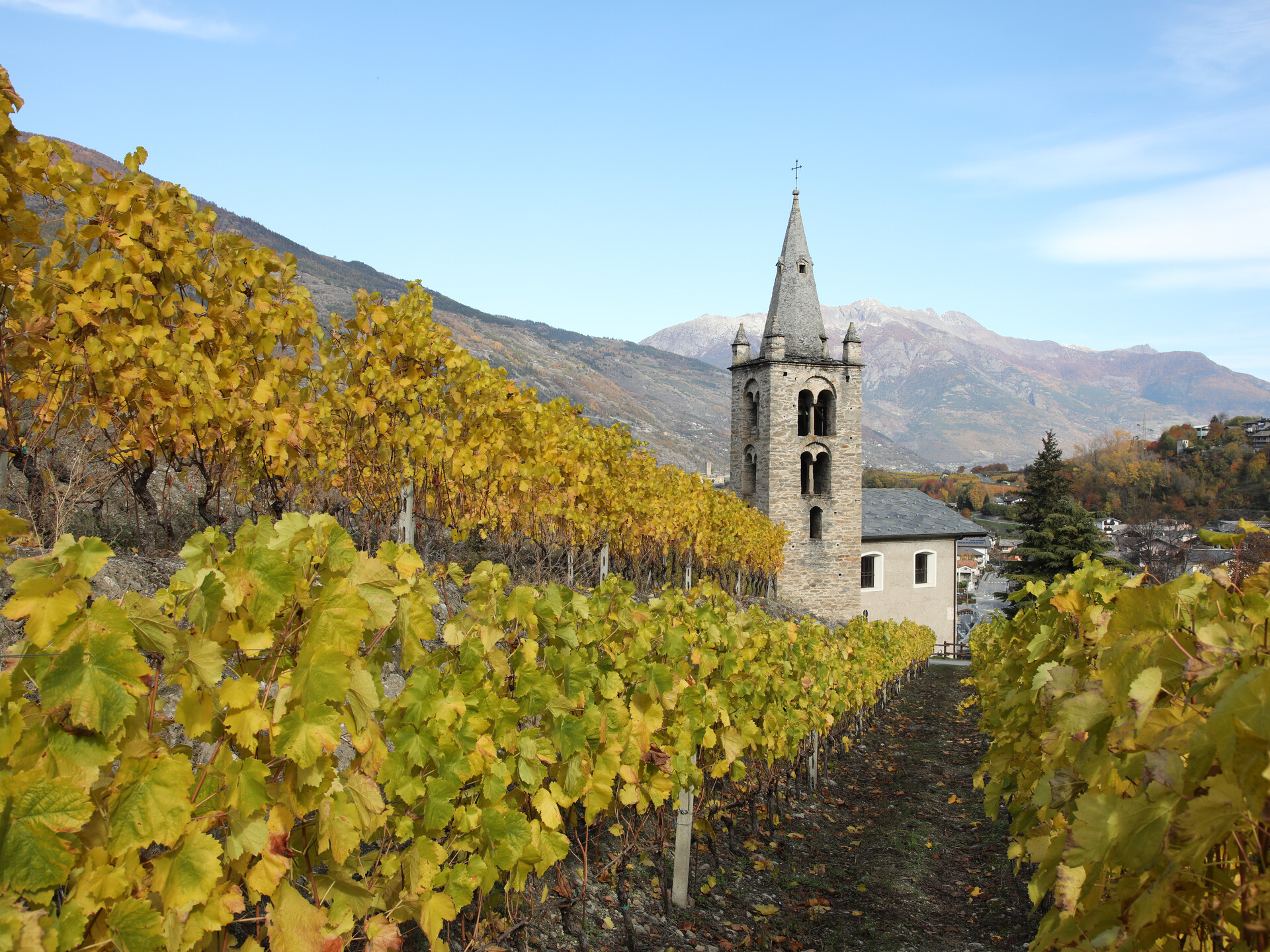 Aymavilles, située à 646 mètres d’altitude au débouché de la vallée de Cogne, sur la droite orographique de la Doire Baltée, offre au visiteur un paysage varié et bien cultivé, où les vignobles et les pommiers embrassent le magnifique château qui domine le territoire. L’emplacement favorable a permis un développement florissant de la viticulture, qui trouve sa force dans la production du vin rouge Torrette et de plusieurs vins locaux très renommés. Le nom Aymavilles provient probablement de Caius Avilius Caimus, promoteur et propriétaire du pont- aqueduc romain Pont d’Aël (3 av. J.C.)