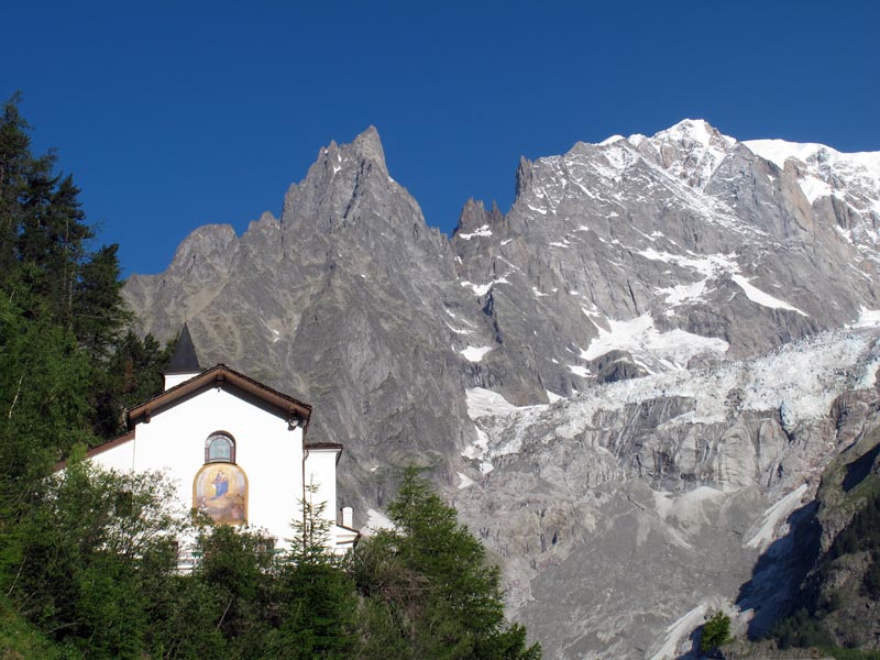 ● Sanctuaire de Notre-Dame-de-la-Guérison : Située à l’entrée du Val Veny, littéralement au pied du glacier de la Brenva, cette petite église - comme le dit la tradition - est le théâtre de guérisons miraculeuses depuis le 17ème siècle. Dans le bâtiment actuel, à partir de 1867, les murs ont été entièrement recouverts d’_ex-voto_, de béquilles et de cadeaux apportés par les fidèles miraculés.