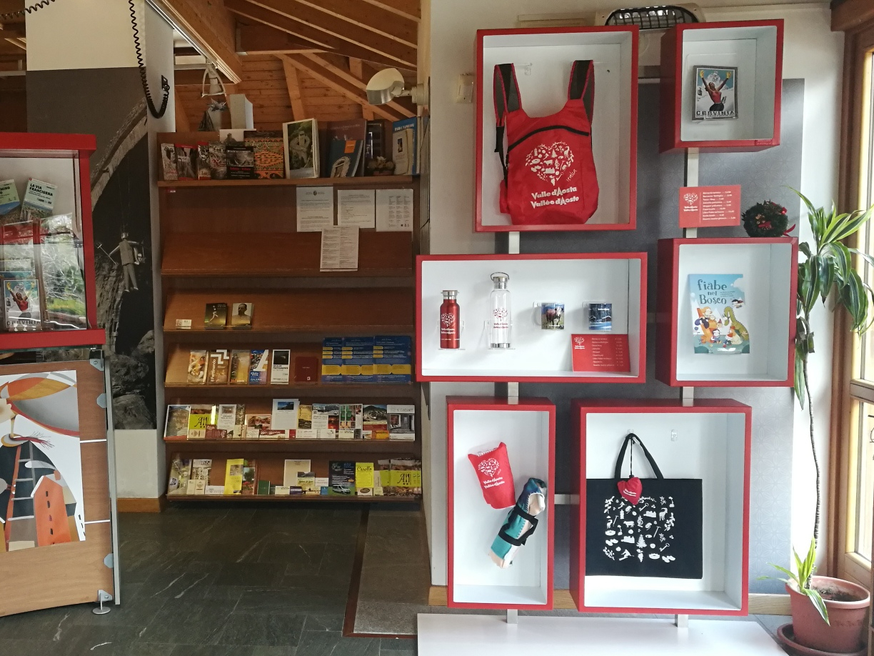 - Vente des cartes de randonnées de la Vallée d’Aoste et de gadgets avec le logo touristique