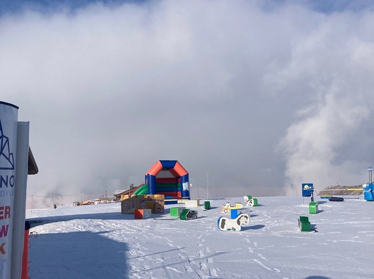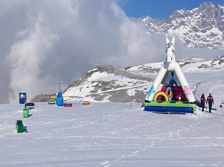 Une aire de jeux petite mais bien équipée sur la neige, située à l’arrivée du téléphérique Valtournenche – Salette, à 2 200 mètres d’altitude au dessus du niveau de la mer, surplombant la crête des Grandes Murailles.