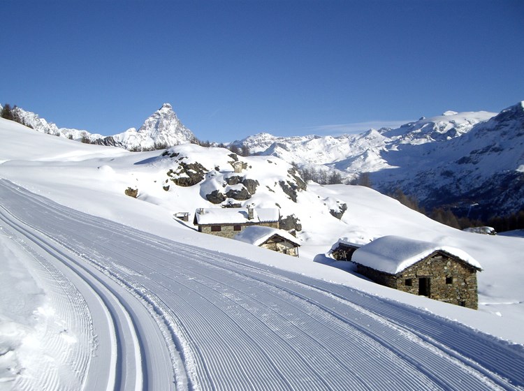 La piste Grandes Montagnes monte nettement vers les pistes de ski alpin et continue à grimper sur le versant occidental du Valtournenche. Le paysage est dominé par une splendide chaîne de montagnes, qui part du mont Roisette et du mont pyramidal du Grand Tournalin et s’étend jusqu’au mont Zerbion. La piste devient un peu plus prenante dans sa dernière partie mais la superbe vue panoramique sur le Cervin mérite bien tous ces efforts.