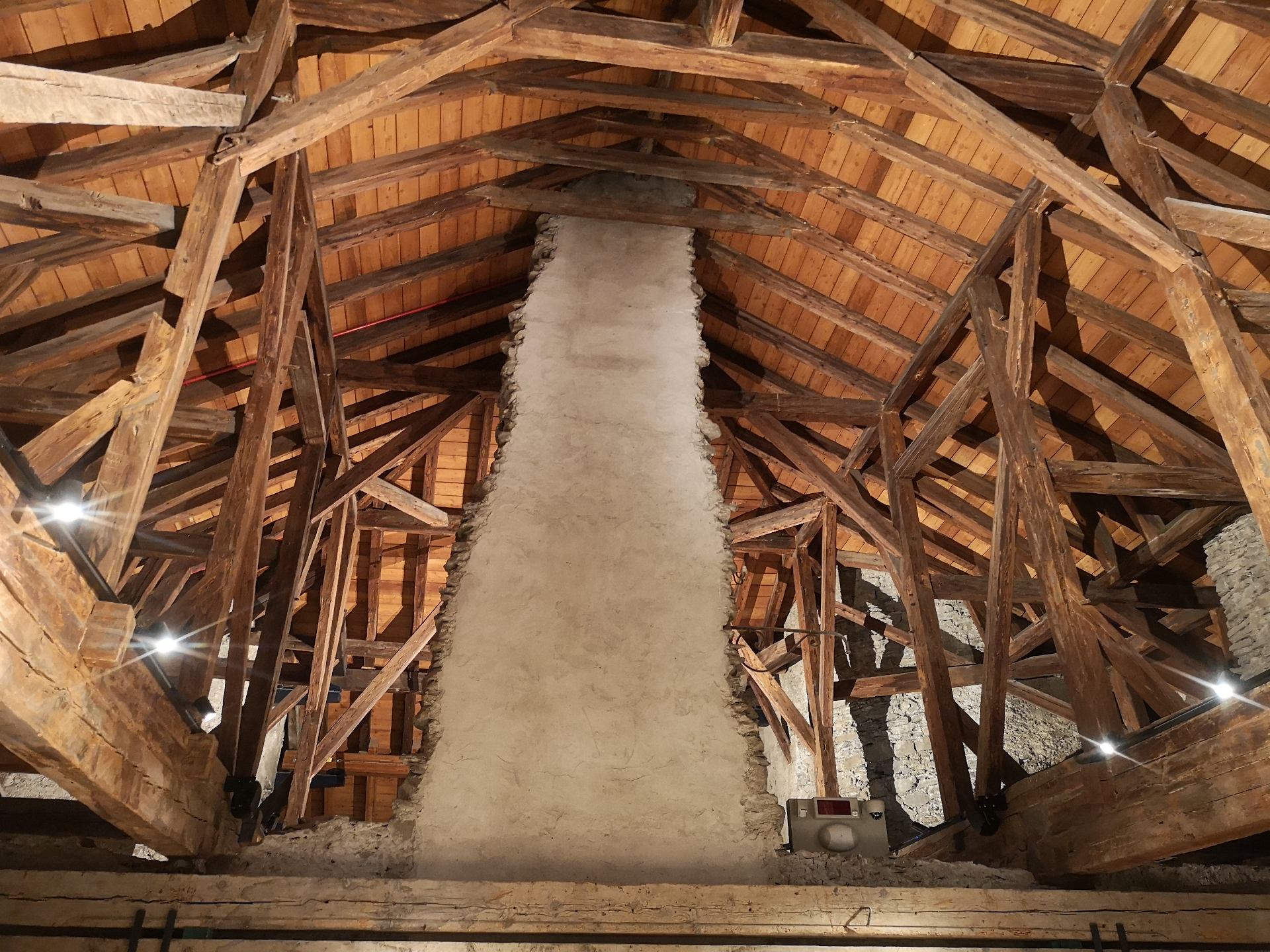 - Niveau IV – les phases de l’évolution du château et le plafond en bois du XVe siècle : la sous-toiture, avec les témoignages architecturaux encore visibles, illustre les transformations de l’édifice au fil des siècles avec le support technologique du multimédia.
