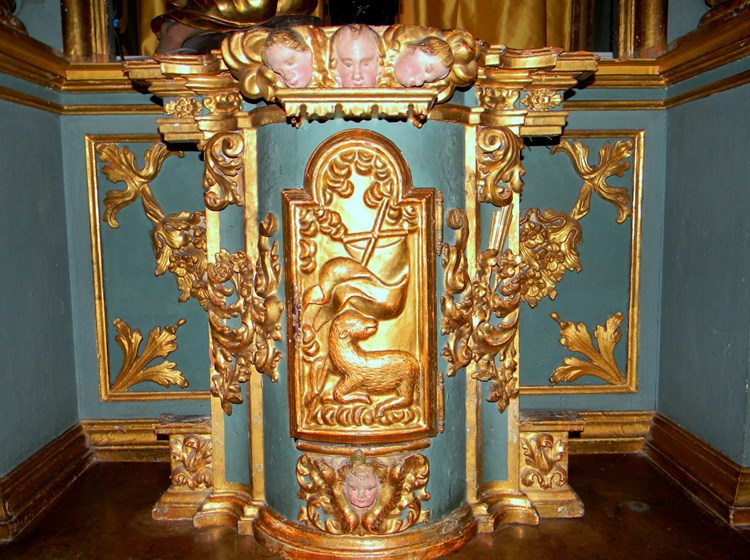 Le décor du XIXe siècle en trompe-l’œil de la façade reproduit une architecture avec une peinture du Recouvrement de la Vraie Croix par Sainte Hélène, mère de l’empereur Constantin.