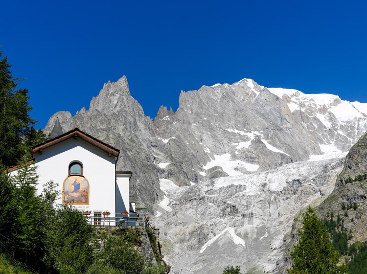 Sur la route quo monte vers le Val Veny, avec en toile de fond le glacier de la Brenva, on trouve cette chapelle, autrefois dédiée à la Vierge du Berrier et qui honore aujourd’hui Notre-Dame-de-Guérison. Ce sanctuaire a été bâti en 1792, sur un tas de pierres. En patois local, “berrier” signifie roche, pierre.