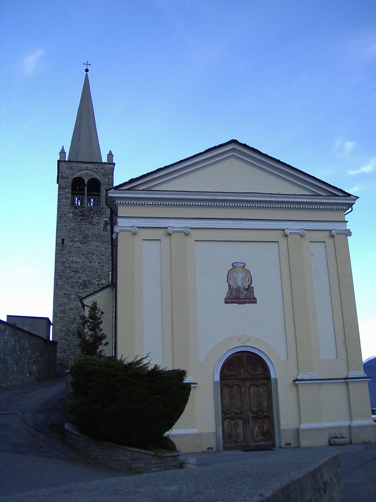Un Christ crucifié du XIVème siècle particulièrement intéressant se trouve à la gauche du chœur. Le Chemin de Croix et le tableau représentant la Sainte-Trinité, la Vierge, Saint-Joseph et les autres saints dateraient des XVIII et XIXème siècles. Le clocher ressemble à ceux construits au quinzième siècle et dont on peut voir des exemples à Etroubles, Gignod, Fénis, Chevrot, Montjovet, Saint-Germain, Moron et Brusson.