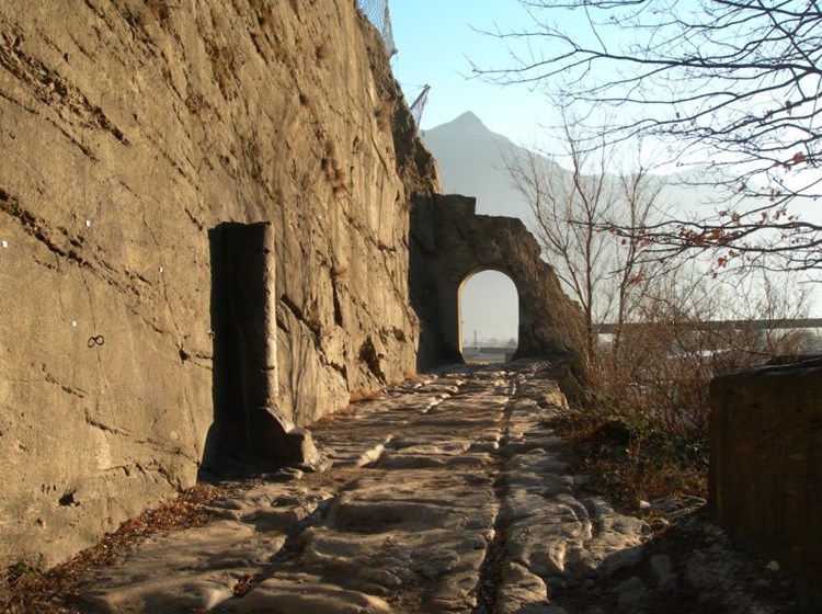 En continuant ainsi sur la route nationale en direction d’Aoste, en longeant la colline terrassée présentant des cultures de vignobles, vous arriverez à Donnas, un ancien bourg apparaissant le long du parcours de la route romaine des Gaules, comme en témoigne encore aujourd’hui l’extraordinaire segment pavé creusé dans la roche et conservant encore les traces du passage séculaire des chars que l’on peut observer à la sortie ouest du village : il présente sur plus de 200 mètres un passage sous un arc creusé dans la pente rocheuse initiale et un peu plus loin, une colonne milliaire affiche l’inscription « XXXVI », correspondant au nombre de milles qui séparaient cette commune d’Aoste ( Augusta Praetoria ). Le bourg médiéval s’ouvre du côté est grâce à une ancienne porte d’accès et s’étend jusqu’à la somptueuse chapelle de Saint-Ours construite précisément sur le sol routier romain ; le centre est parsemé d’anciennes demeures, dont certaines présentent des éléments architecturaux particulièrement intéressants tels que les majestueuses fenêtres jumelées et les fenêtres à croix guelfe (XV-XVIème). Le centre abrite également le Palais Enrielli, datant du XVIIème siècle dont la tour cylindrique atteste de sa singularité et la Maison-tour du Bourg constituant actuellement le siège de l’Institut musical.