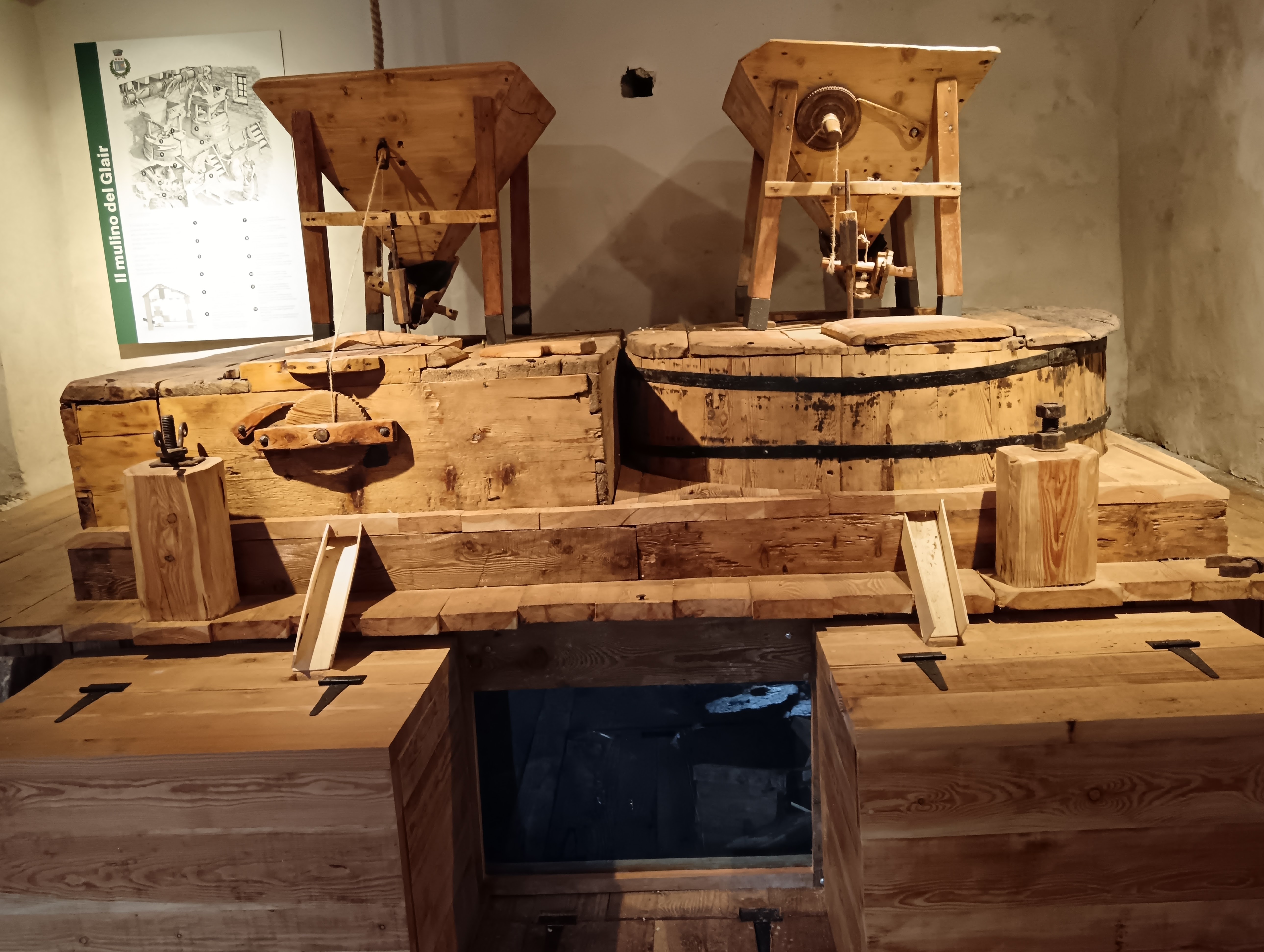 Con due antiche macine, composte da blocchi di pietra, il mulino era essenziale per la macinatura di segale e mais, coltivati sui terrazzamenti a monte del villaggio. La sua storia è testimoniata da documenti risalenti agli inizi del Quattrocento, mentre il nome “Glair” (da "glairs", cioè ghiaioni, abbandonati dai corsi d'acqua in occasione delle esondazioni) richiama il suo passato di terra alluvionale, segnata da secoli di esondazioni, come quella devastante del 1655.