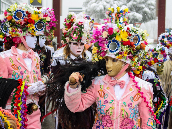 Il carnevale inizia il giorno dopo l’Epifania e si conclude il martedì grasso. I personaggi sono sempre gli stessi ed il loro ordine nella sfilata è rigidamente stabilito. Il corteo è preceduto da un Portabandiera o Guida, che lo dirige con la sua trombetta. I simboli della sua autorità sono gli occhiali e i baffi. Il gruppo musicale (costituito da due o tre musici che suonano la fisarmonica e/o il sassofono) segue la guida e precede il Diavolo, che indossa un corto mantello rosso. In mano tiene una forca della quale si serve per fare inciampare le persone. Dopo di lui vengono, a coppie, le Damigelle e gli Arlecchini. Troviamo in seguito i Neri, che simboleggiano le lunghe notti invernali, e i Bianchi, che annunciano le giornate solatie della primavera. Le maschere dei colori li seguono e tutti agitano una coda con la quale solleticano la gente. Il “Toc” e la “Tocca” (cioè i due sempliciotti) si trascinano dietro al corteo: lui fa cadere il cappello agli uomini, accarezza con il suo bastone la schiena ai bambini e solletica le gambe delle donne. Quest’ultima azione solleva la gelosia della “Tocca” che si getta su di lui e lo picchia senza pietà. Sono seguiti dall’Orso e dal Domatore. La bestia, che simboleggia anche la fecondità, insegue le donne e i bambini e getta gli adulti nella neve.