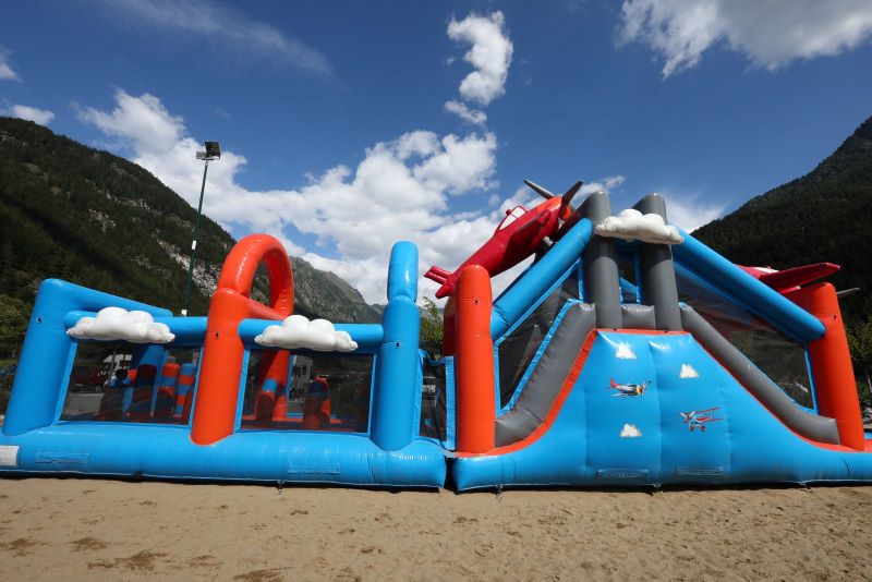 Giochi gonfiabili: scivolo Pirata, multi gioco Dino, Aereo, Castello - Tappeti elastici: grande con 5 postazioni e piccolo con 3 postazioni - Cupola da arrampicata - Playground (multigioco con scivoli ecc) - Giochi da sabbia per i più piccoli (palette, secchielli, camioncini, ecc) e casetta Puffi e Castellino.